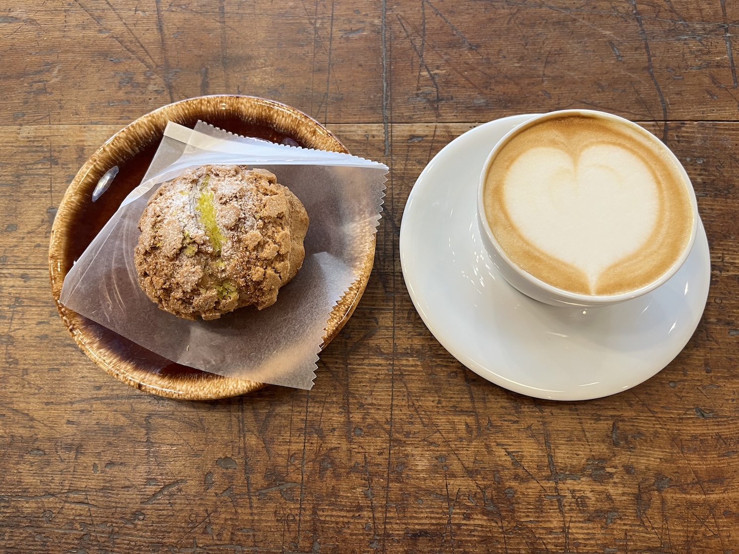 そこへ、『LEAVES COFFEE』の浅煎りのブラジルがじんわりと広がる。やわらかな酸味が、ピスタチオのコクとミルクの甘みを引き締め、ナッツの香ばしさが余韻に重なる。重たくなりがちなクリームパフを、軽やかにしてくれる一杯だ。口当たりはやわらかく、ナッツの風味が重なり合って互いを引き立てている。