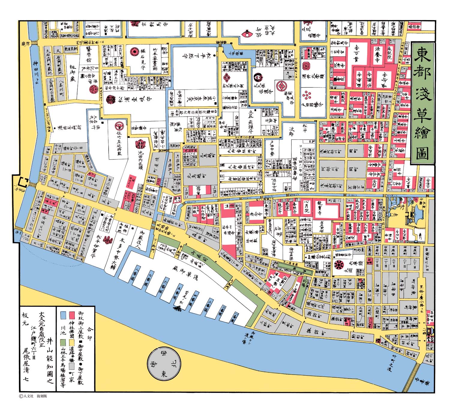 徳川幕府が天領(直轄地)の年貢米などを備蓄した倉庫。蔵前という地名の由来にもなった。浅草御蔵の米は旗本や御家人に支給するため、勘定奉行が管理した。切絵図には8つの堀が描かれ、規模の大きさがわかる。
