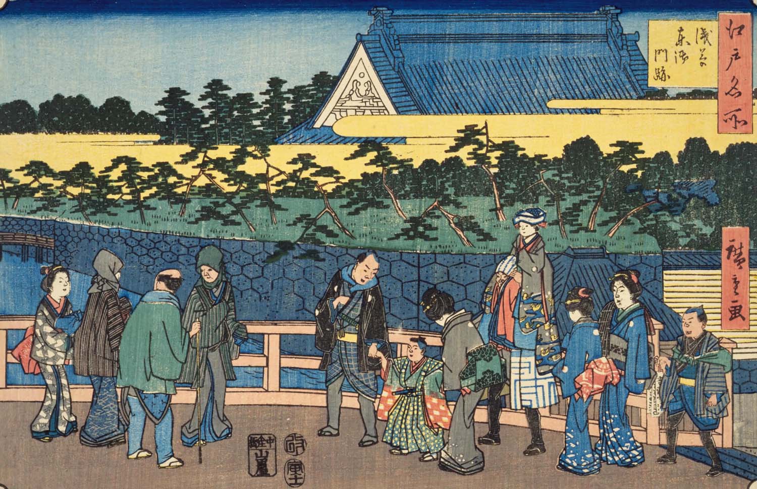 切絵図の右側には浮世絵に描かれた「東本願寺」(東御門跡)がある。表門が面する通りには「キクヤハシ」とあり、浅草通りの菊屋橋交差点と重なる。交差する新堀川は暗渠化され、現在の新堀通りになっている。「浅草御蔵」の右側にある「八幡宮」は蔵前神社、隣の「正覚寺」は榧寺、切絵図中央の元鳥越町にある「鳥越明神」が鳥越神社だ。武家屋敷「松浦壱岐守」の跡地には忍岡高校が立ち、江戸時代からの大イチョウと大名庭園があったことを示す蓬莱園跡碑が残っている。