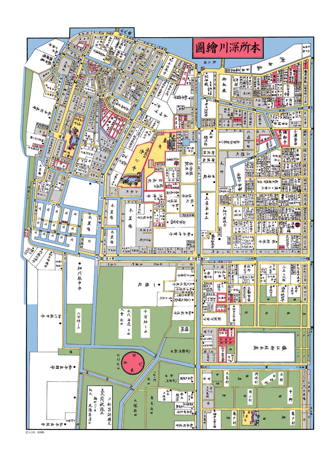 切絵図左上に「富岡八幡宮」があり、歌川広重が浮世絵に描いた鳥居も見られる。社殿の絵の横にある「永代寺」は成田山新勝寺の出開帳を行った場所で、後に成田山深川不動堂が立つ。