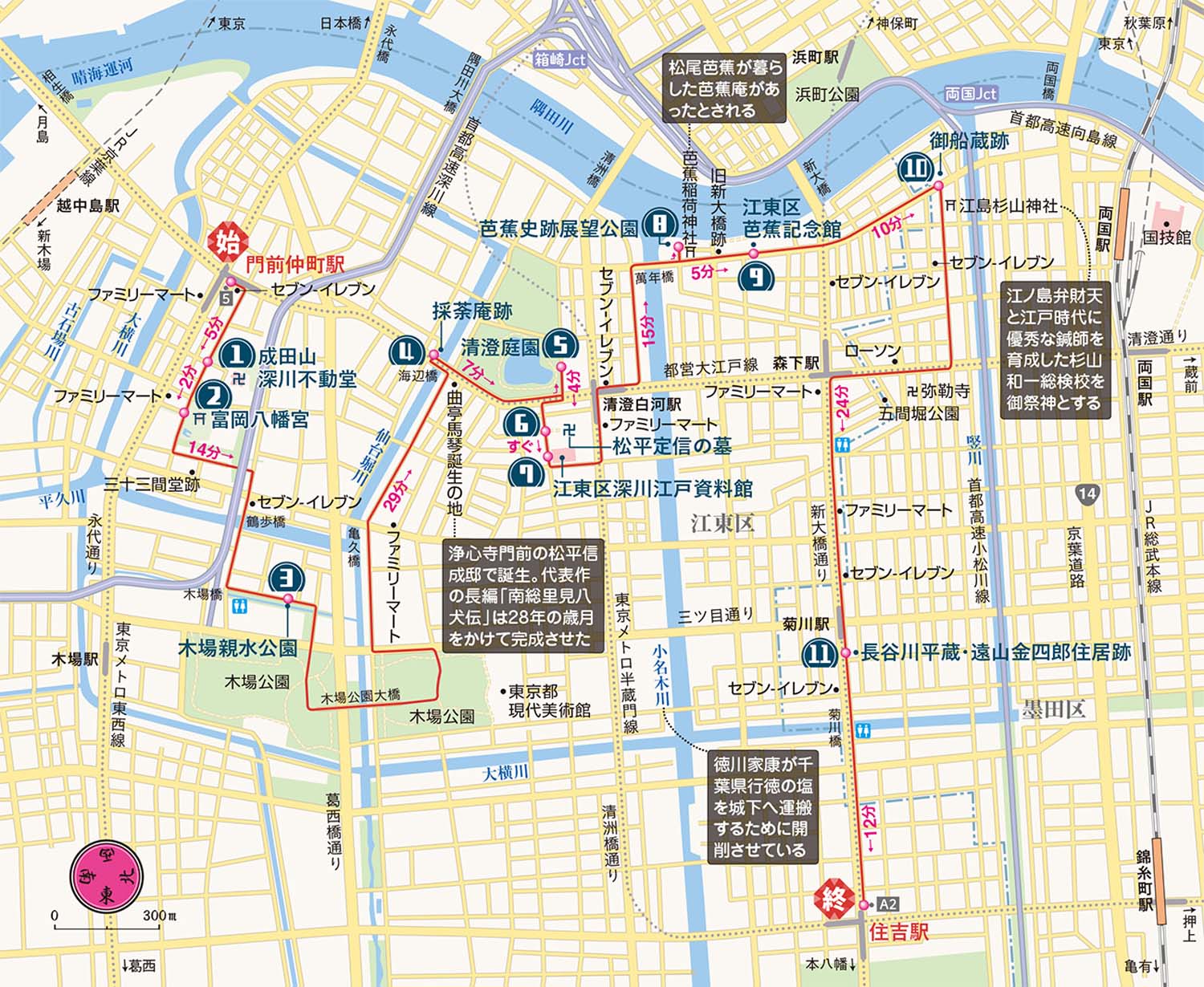 地下鉄東西線・大江戸線門前仲町駅→(5分/0.3km)→成田山 深川不動堂→(2分/0.2km)→富岡八幡宮→(14分/0.9km)→木場親水公園→(29分/1.9km)→採荼庵跡→(7分/0.6km)→清澄庭園→(4分/0.3km)→松平定信の墓→(すぐ)→江東区深川江戸資料館→(15分/1.0km)→芭蕉庵史跡展望庭園→(5分/0.3km)→江東区芭蕉記念館→(10分/0.6km)→御船蔵跡→(24分/1.6km)→長谷川平蔵・遠山金四郎住居跡→(12分/0.8km)→地下鉄半蔵門線・新宿線住吉駅
