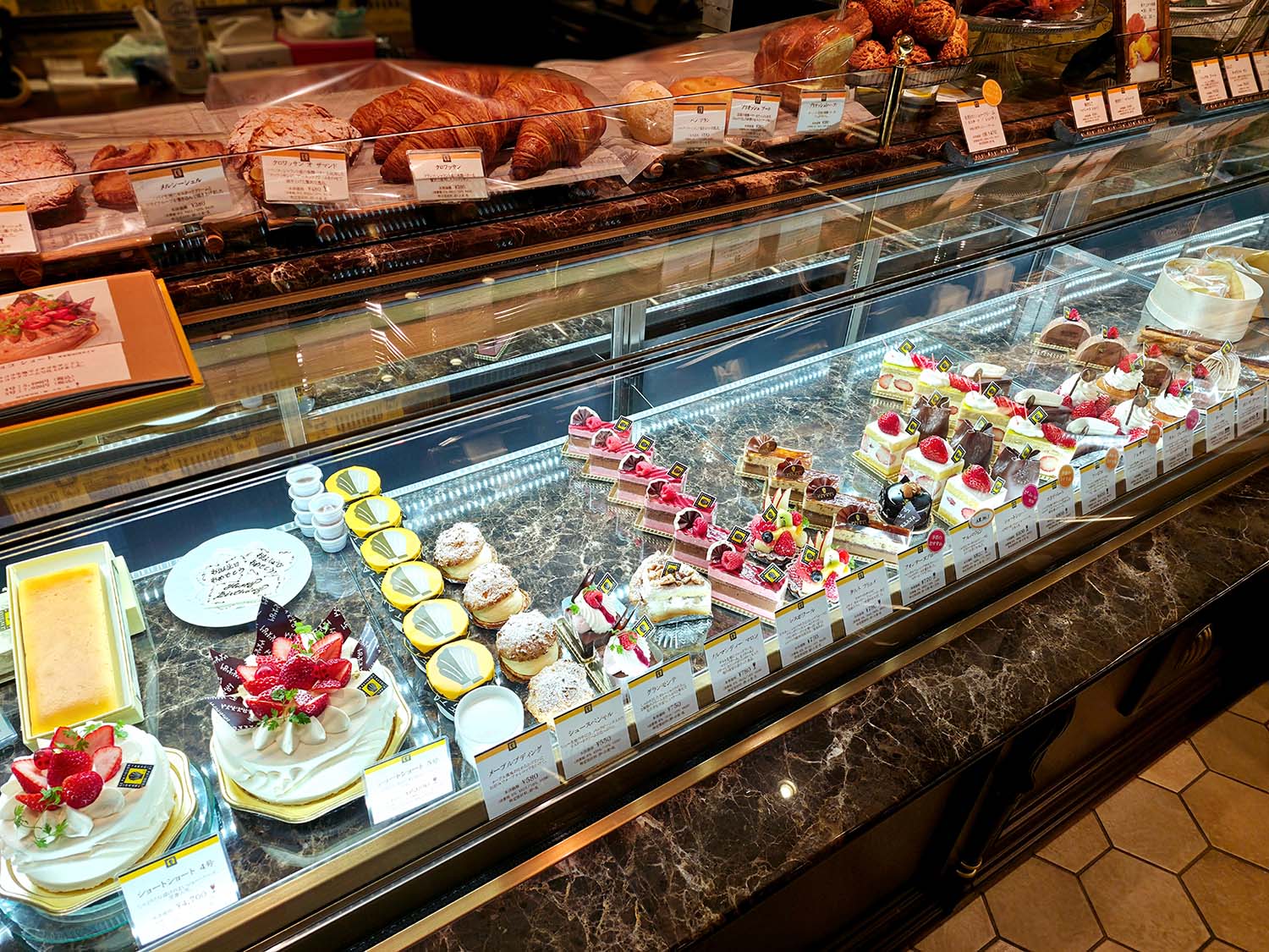 ショーケースに並ぶホールケーキやプティガトーは、定番のものから季節限定までいろいろ。