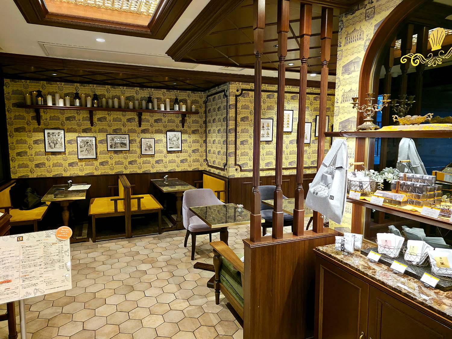ラグジュアリーな雰囲気の店内には、洋生菓子、焼き菓子、ショコラ、パンなどが並びます。