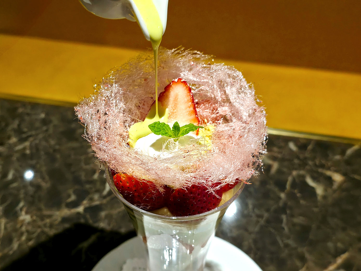 TOPを飾るシュクルフィレ(糸飴)が美しいパフェは、たっぷりのいちご(とちあいか)と、もうひとつの主役ピスタチオを堪能できる一品です。