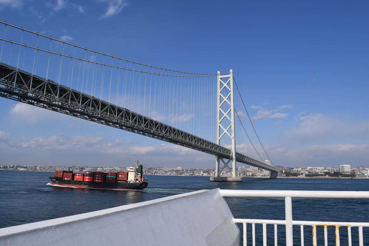 うどんを食べ終えてひと休みしていると船が明石海峡大橋をくぐるタイミングが近づいてくる。天気のいい日に展望デッキに出て橋を下から見上げるのもまた、この船の大きな楽しみなのである。