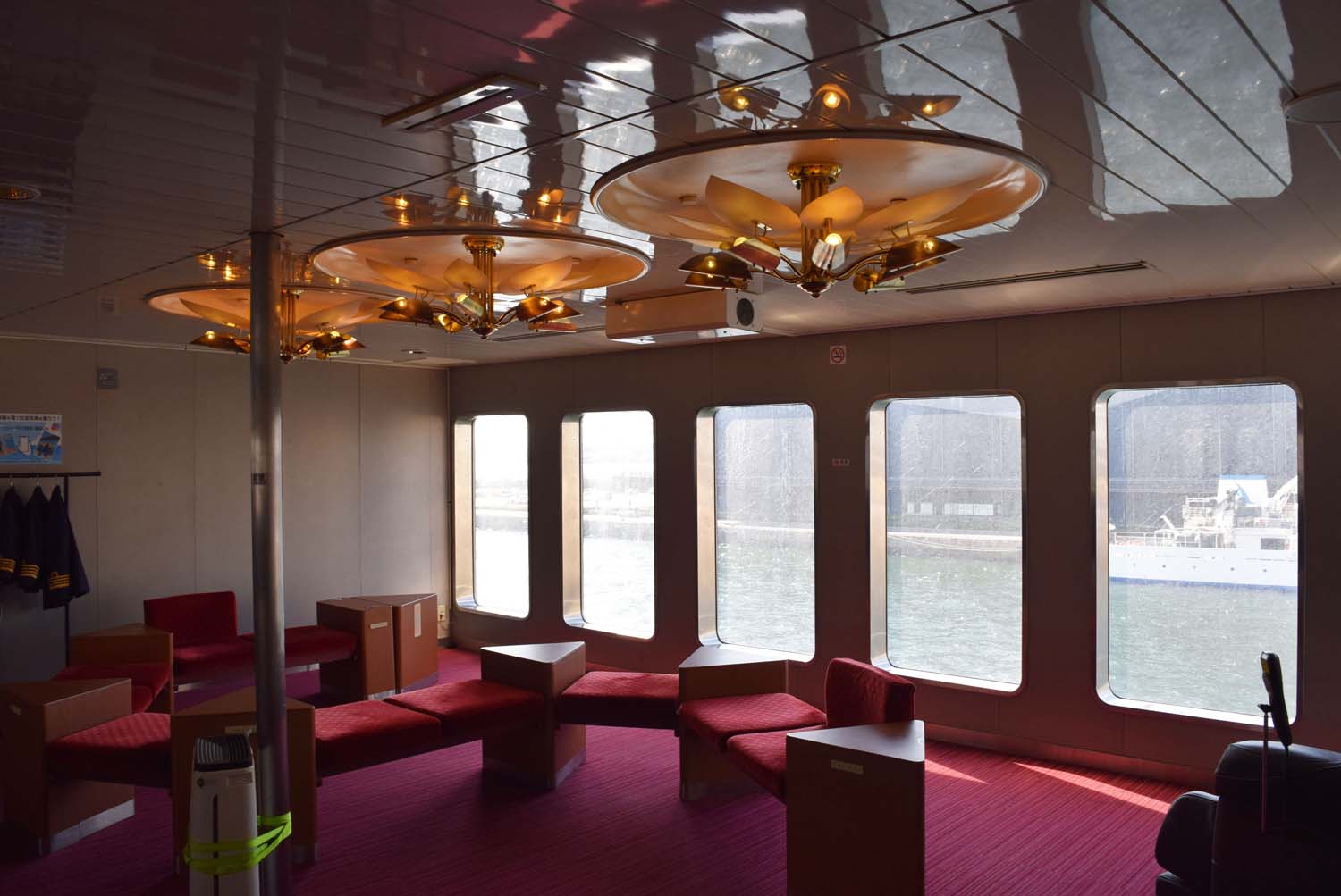 ジャンボフェリーの企画開発担当、永井さん、平松さんに船内を案内していただきつつ、お話を伺った。就航から36周年を迎えた「りつりん2」の船内はレトロな雰囲気が漂っているが、この時代感が好きだという声もあり、あえて乗船時間を調整して乗る人も多いのだそう。たしかに、えんじ色の絨毯や照明の凝った造形、一人一枚まで自由に使えるゴザが収められたボックスなど、それぞれに味わい深く、私もこの雰囲気が大好きである。