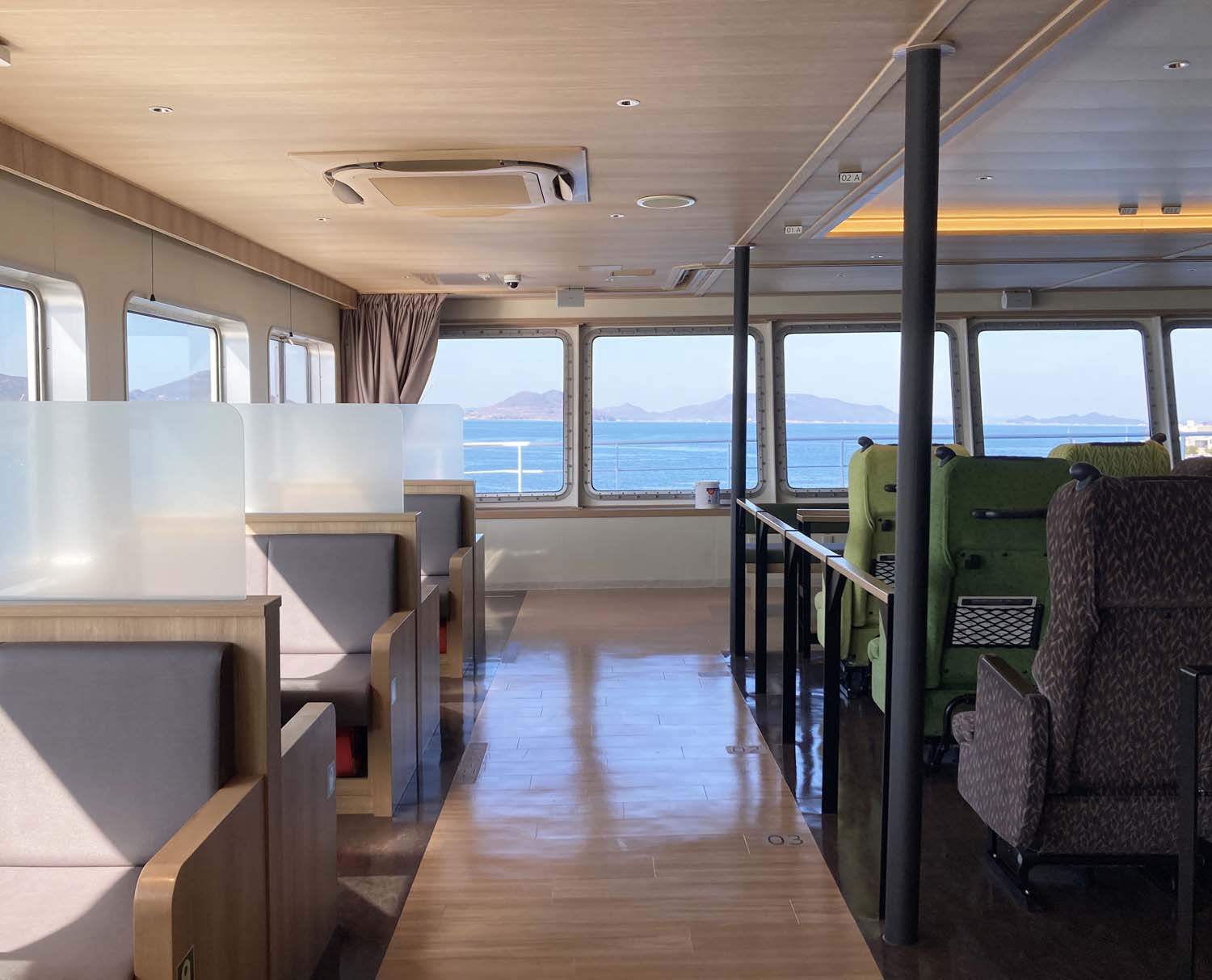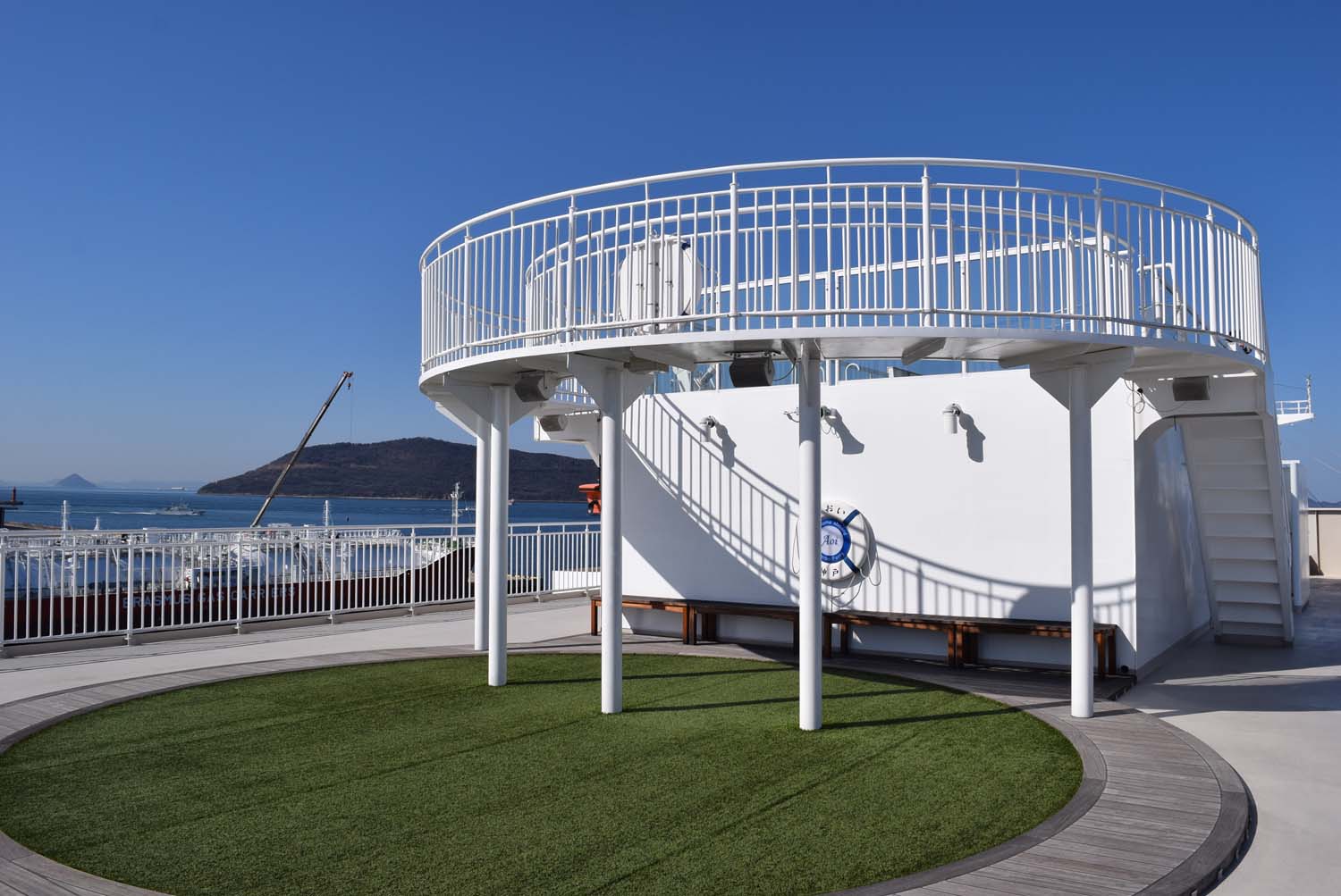 一方の「あおい」は“瀬戸内海に浮かぶテラスリゾート”をコンセプトに、ファミリー層も含めた幅広い客層が快適に過ごせるよう、細部までこだわって設計されているそう。そもそも、「りつりん2」が造船された当時は小豆島への航路はなく、トラックのドライバーや日常の交通手段として船を利用する方々を想定して船が設計されたそうだが、その後、小豆島航路がスタートすることで観光客が大幅に増え、その需要に応える船が待望されていたのだとか。