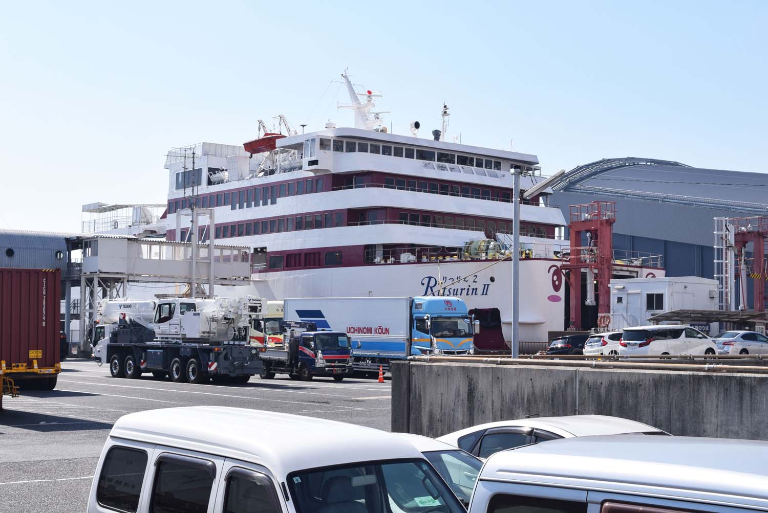 神戸の三ノ宮駅からフェリー乗り場までは連絡バスを利用してもいいし、徒歩でも20分ちょっとの距離である。乗り場に近づいていくと、停泊している船体の巨大さに毎度驚く。船内はプライバシー保護の観点から客室内などが撮影禁止となっているが、乗船が始まる前の時間に特別に撮影させていただくことができた。