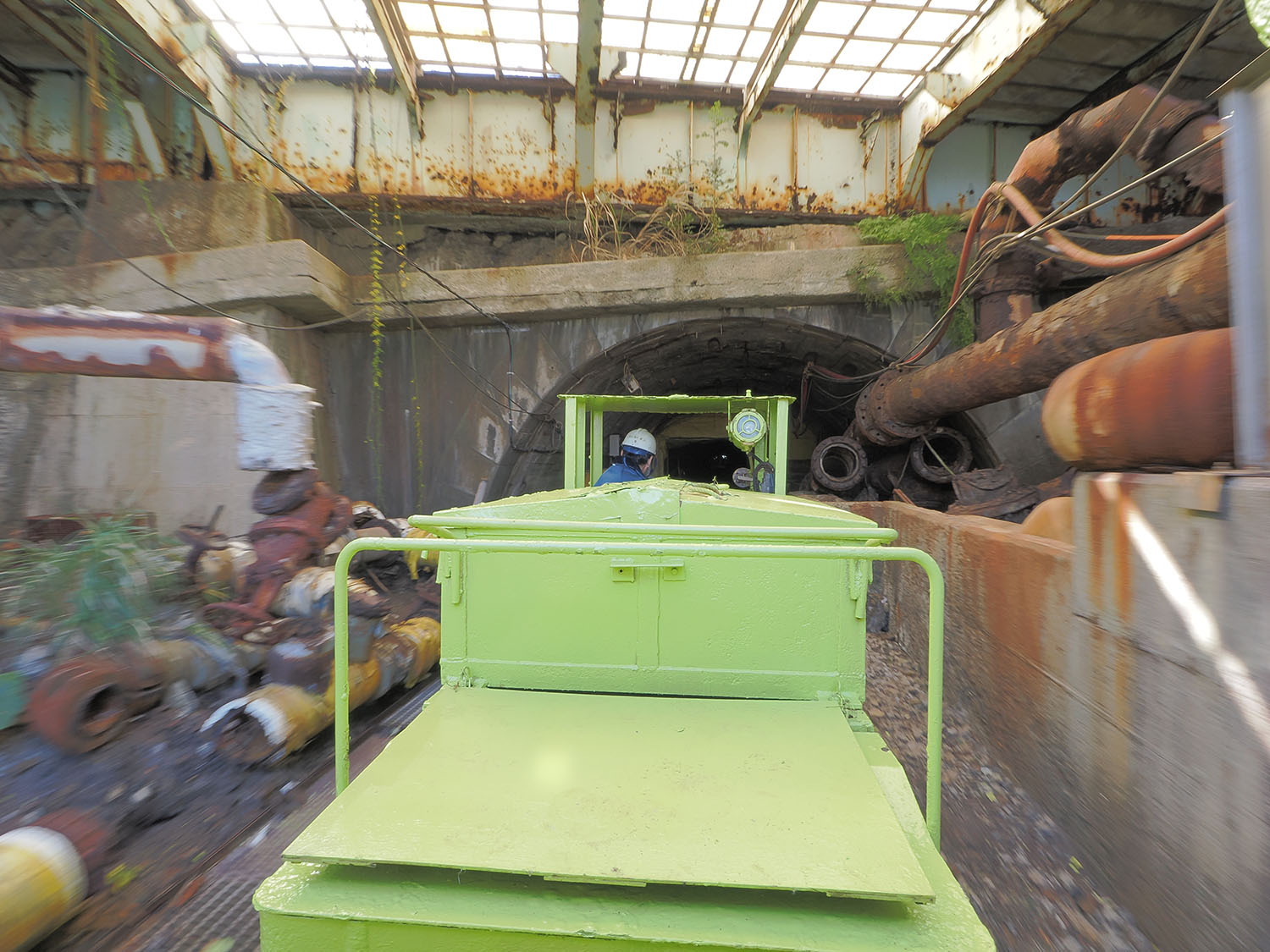 この軌道は本来の役目を終え、いわば廃線跡となります。それがツアーとして復活して生かされていることに感動しました。軌道は貯炭場の真下へと延び、その先はトンネルの坑口が口を開いていました。水平坑道です。