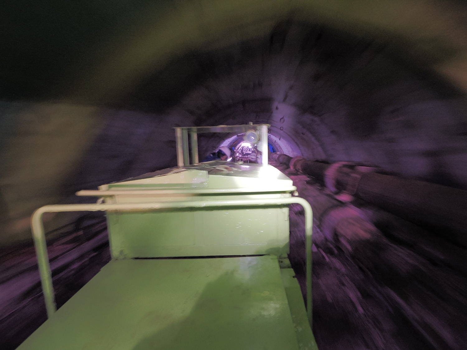 いよいよ坑内へ! 移動は炭鉱トロッコです。バッテリー機関車には作業員を乗せる人車(いわゆる客車)が連結され、ドアもない骨組みの車両に乗車します。坑内を走行した車両のため小さく、屋根は鉄板剥き出し。中腰で座ろうとすると頭を打ち、早くもヘルメットに助けられました(笑)。