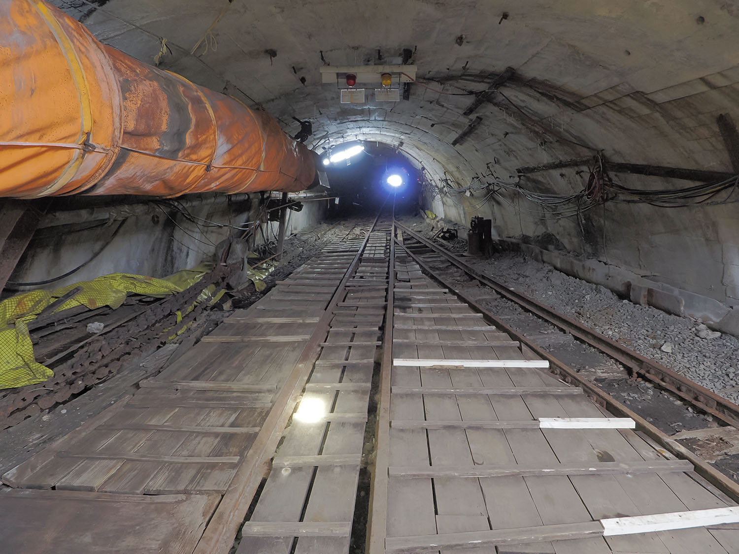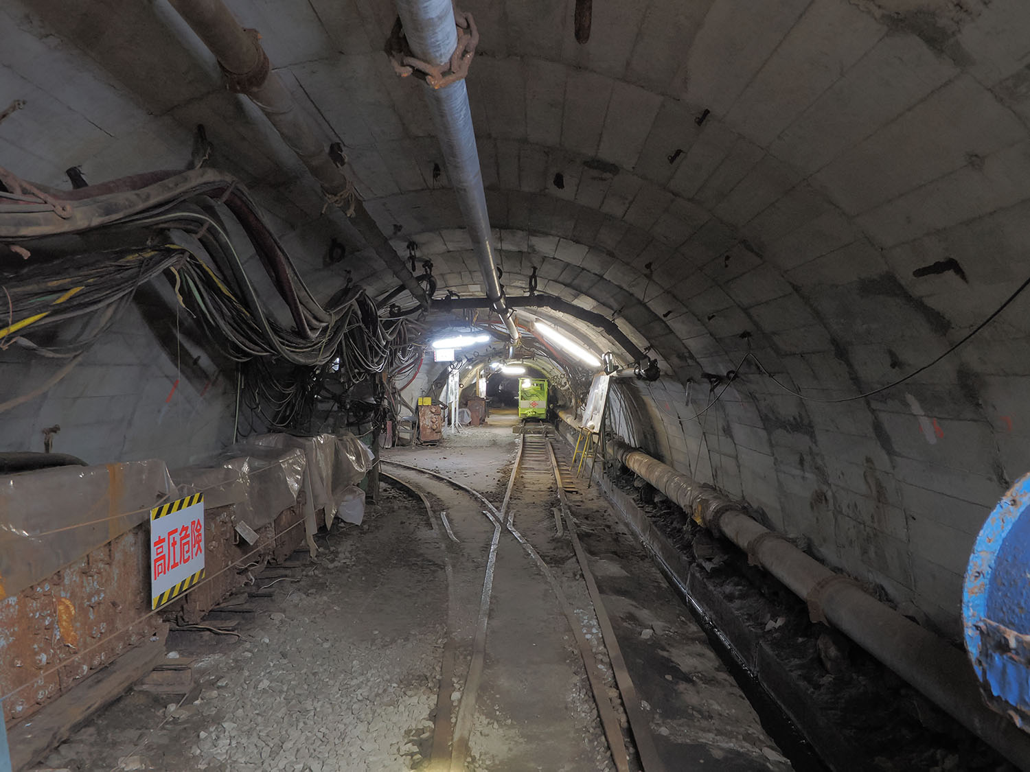 軌道は斜坑にも敷かれており、かつては人車がケーブルカーのように昇降していました。斜坑は200mほど先に明かりが見え、現在も外界と繋がっています。軌道のレールも光の先へと続いていて、その先が気になりますが現在は立入禁止となっています。