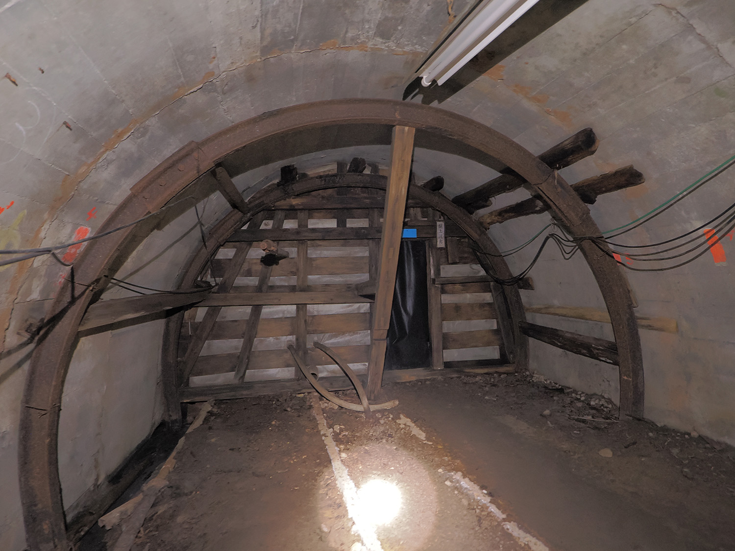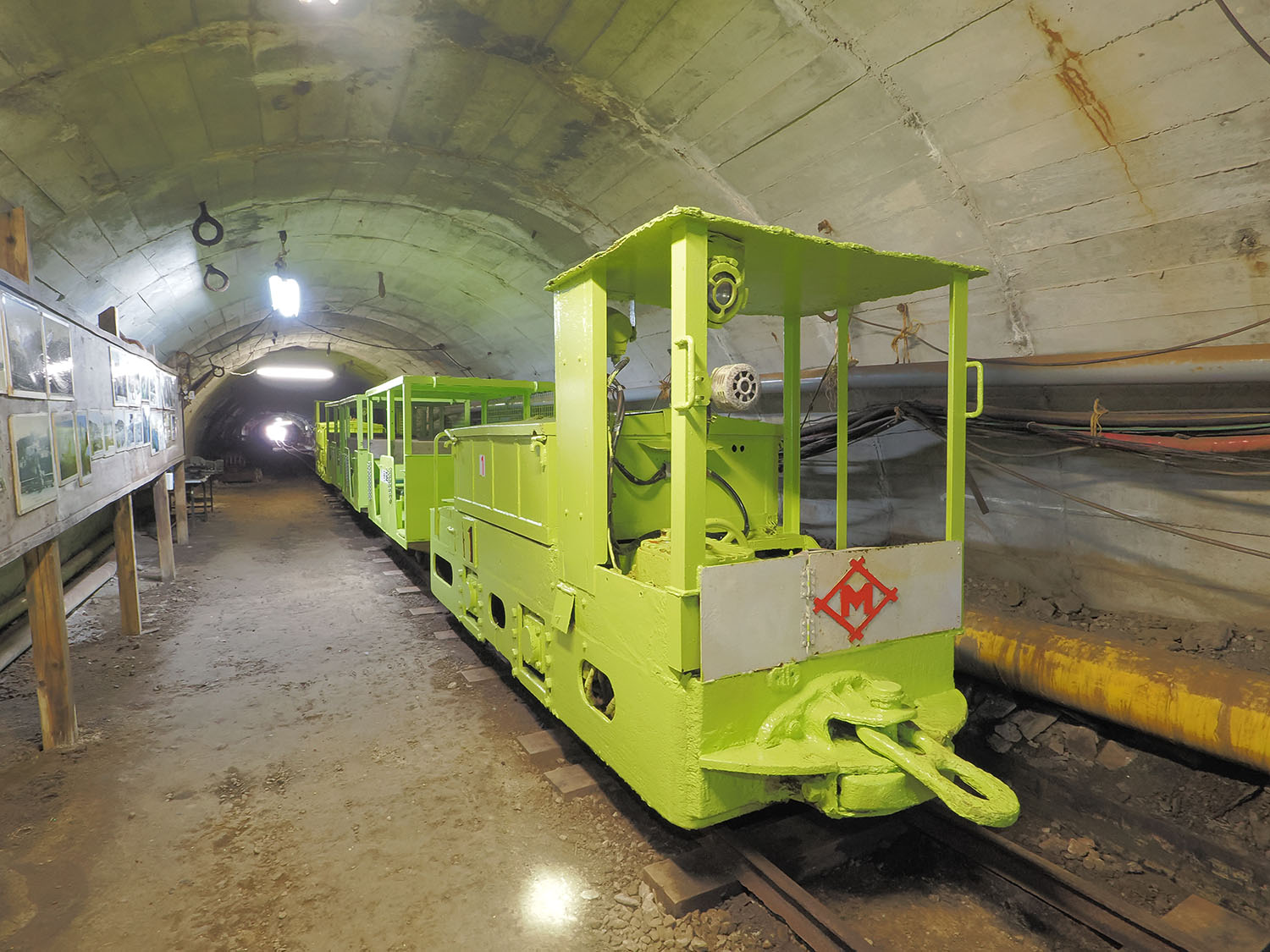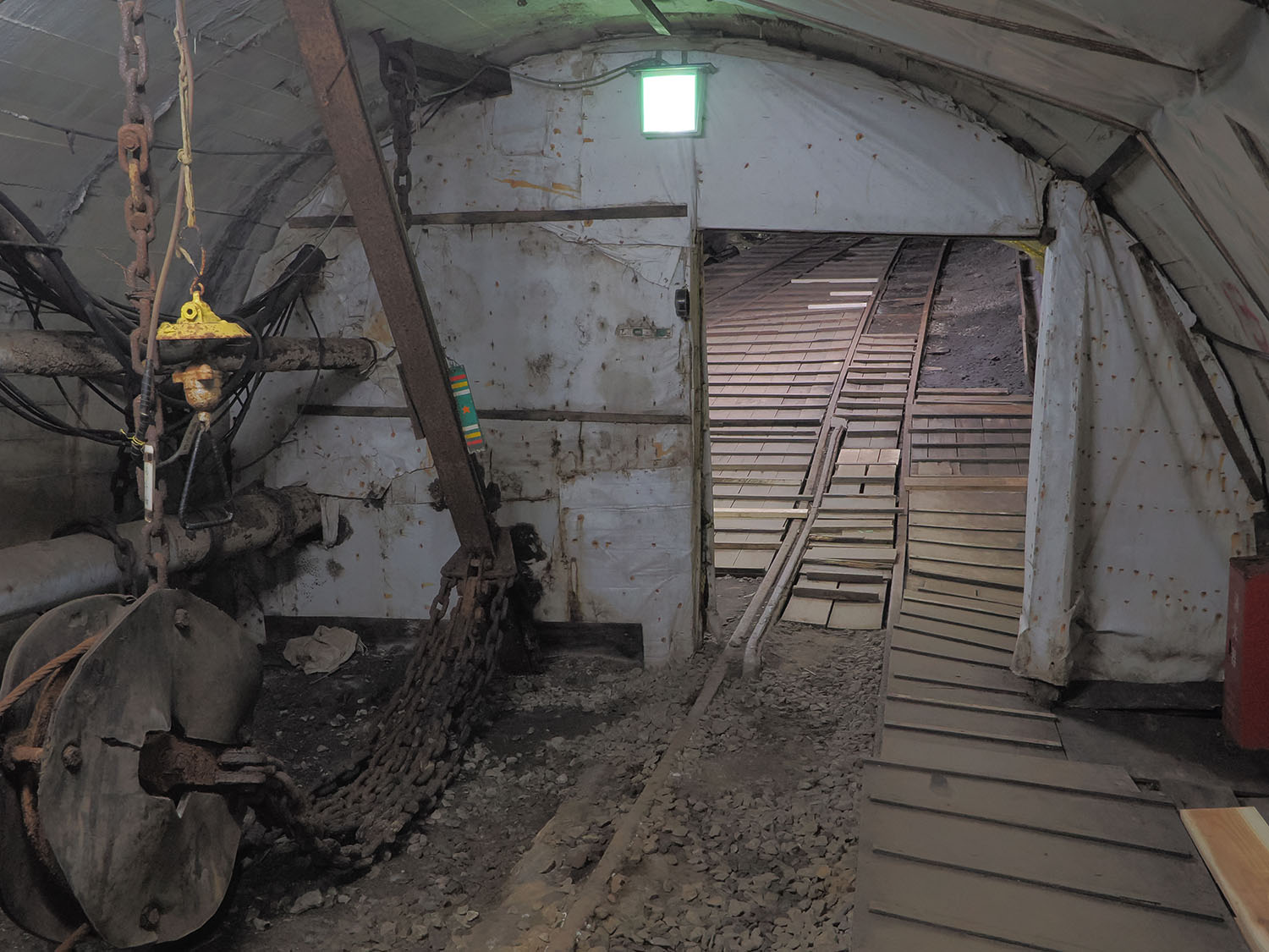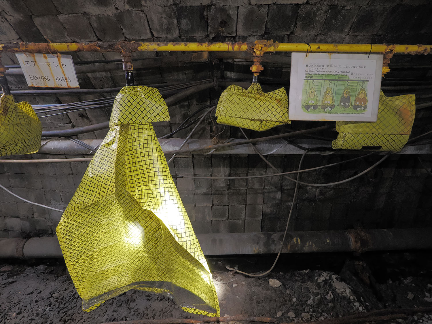 坑内は事故発生を想定し、いくつもの安全対策が施されており、緊急避難所になっていた坑内救急センター跡地も見学できます。地上では常にモニターで坑内を監視し、不測の事態が発生した際はすぐ救助活動が実施される体制でしたが、場合によっては救助に時間がかかります。その間に酸素不足や光源の喪失などならないよう、至るところにある酸素の管を使用し、複数人の場合はどちらかのライトを消す。そうやって生命線を確保し、しばらく坑内へ滞在せざるを得ない場合も想定し、要所に緊急避難所が設置されていました。