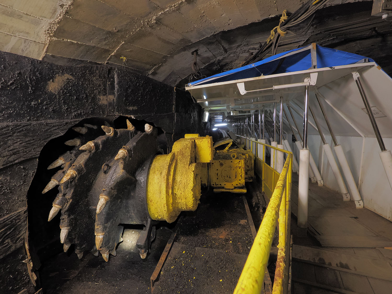 レールの先の坑道は閉塞していました。ここは石炭採掘の研修用に用意された擬似坑道で、大型の掘削機械が鎮座し、坑道を支える支柱が並びます。掘削機械は先端が強靭な爪の付いたドラムカッターで、回転しながら岩石を掘削し、石炭を掘り続けていきます。機械は眠りについていますが、ひとたび動けば相当な音と振動が坑内に轟いたのでしょうね。