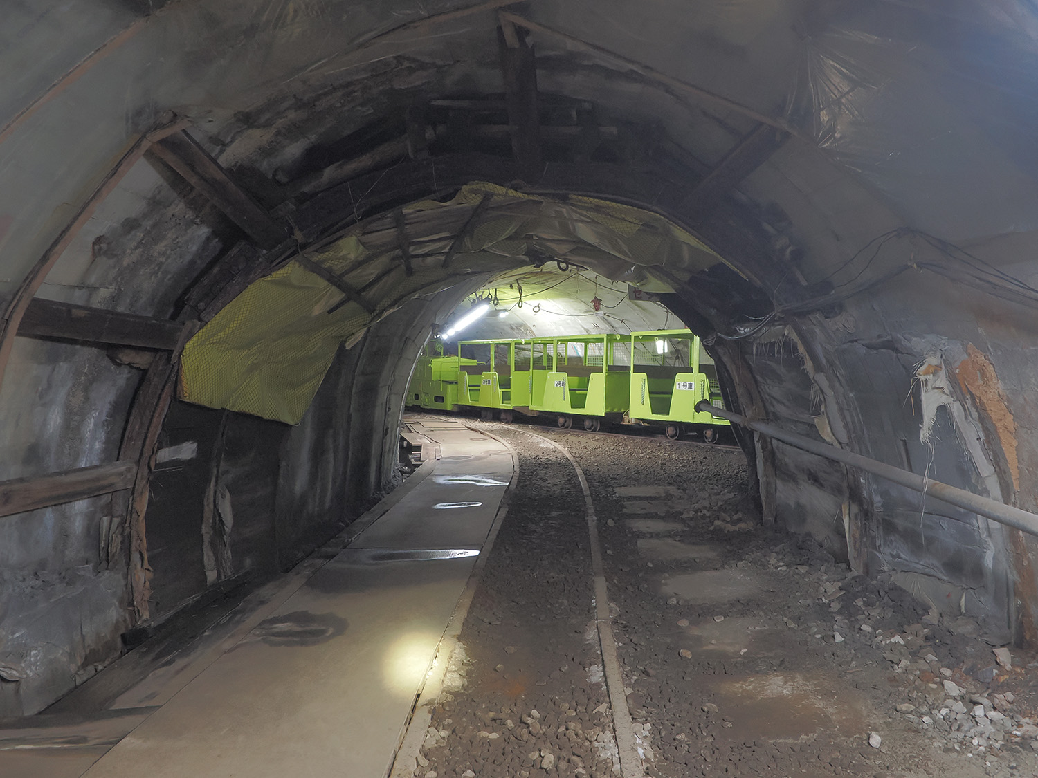 高揚感に包まれているのも束の間、人車は300mほど坑道を走行して停車しました。直前にトンネルが二股へと分岐し、地面に埋もれかけたレールが右へと分かれていくのが非常に気になります。ツアーは「坑内体験」と銘打っているだけあって、レールよりも坑内作業に重きを置いています。ガイドさんに置いてかれないようついて行きましょう。