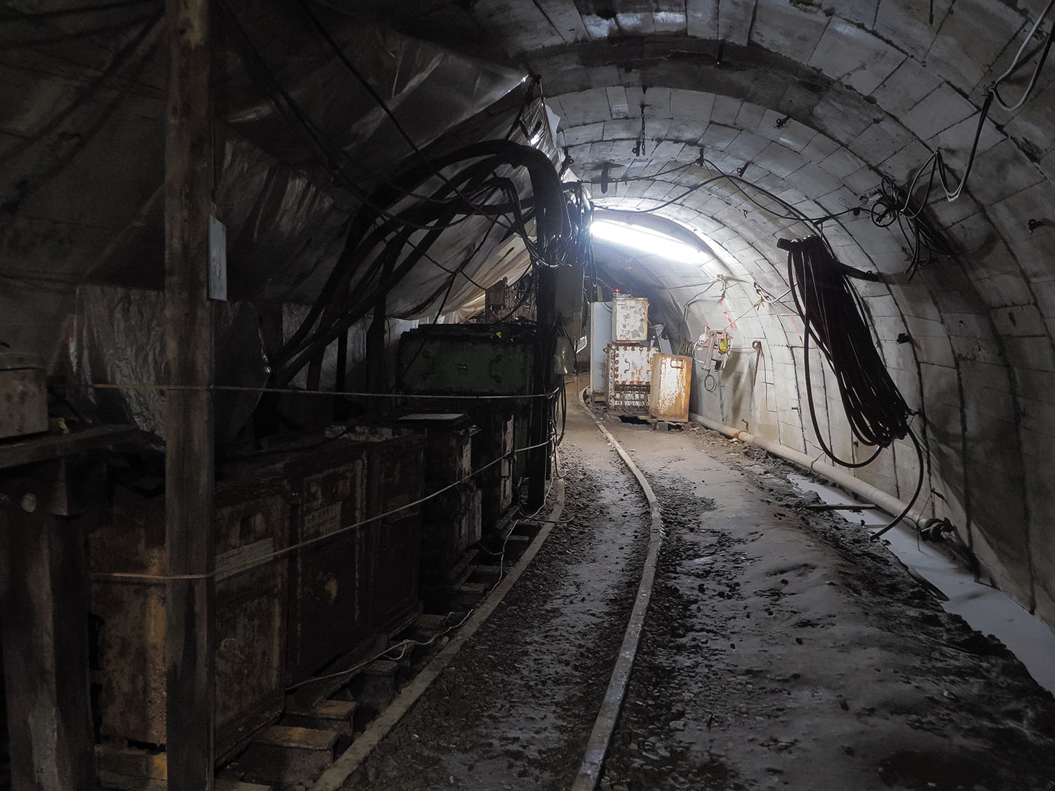 坑内はコートを着ているためか寒くもなく暑くもなく、温度計は摂氏11℃を示していました。外気温とさほど変わらないですが、夏場は摂氏20℃ほどで涼しいとのことです。軌道を辿りながら坑内を進むとまた二股へ分岐しており、左手の軌道はプツッと途切れています。いいねぇ、こういう途切れ具合。レールがしっかりとした車止めで終わるのではなく、前触れもないままにプッツリ途切れる姿は大好物です。