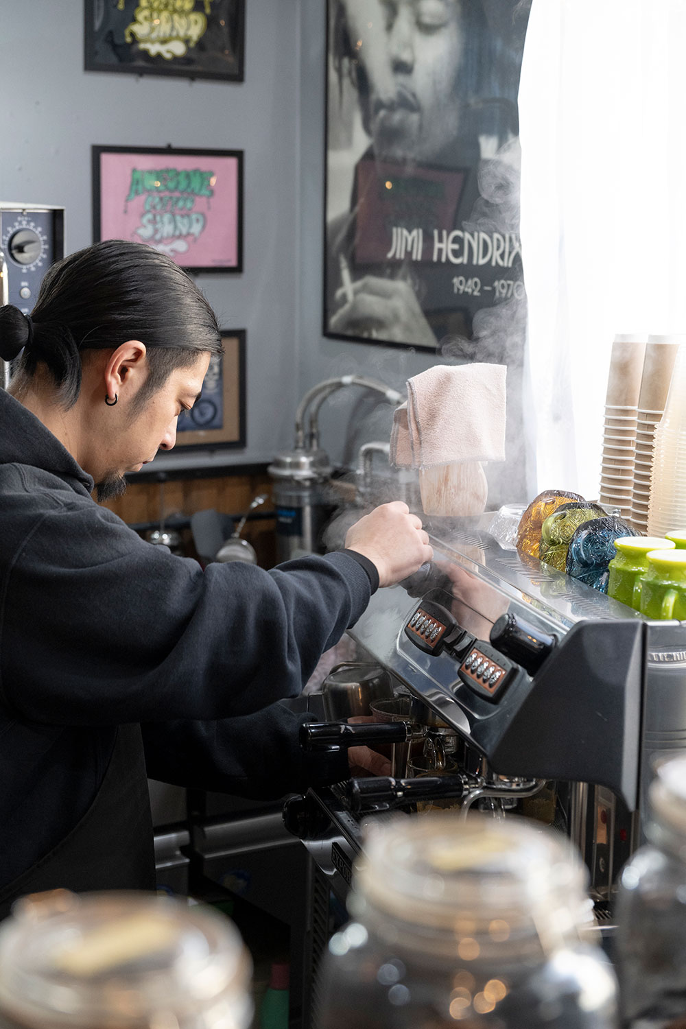「日本でも有数の待ち時間らしくて、20分開かないことも。踏切待ちの車からサッとコーヒーを買いに来る方もいますよ」とは、すぐ脇のレトロな建物で2022年から営む『AWESOME COFFEE STAND』の上地蔵さん。警報機の音が常に聞こえる店内で目を引く大きな窓はショーウインドーの名残。実はブティックだった店舗を活用しているそう。