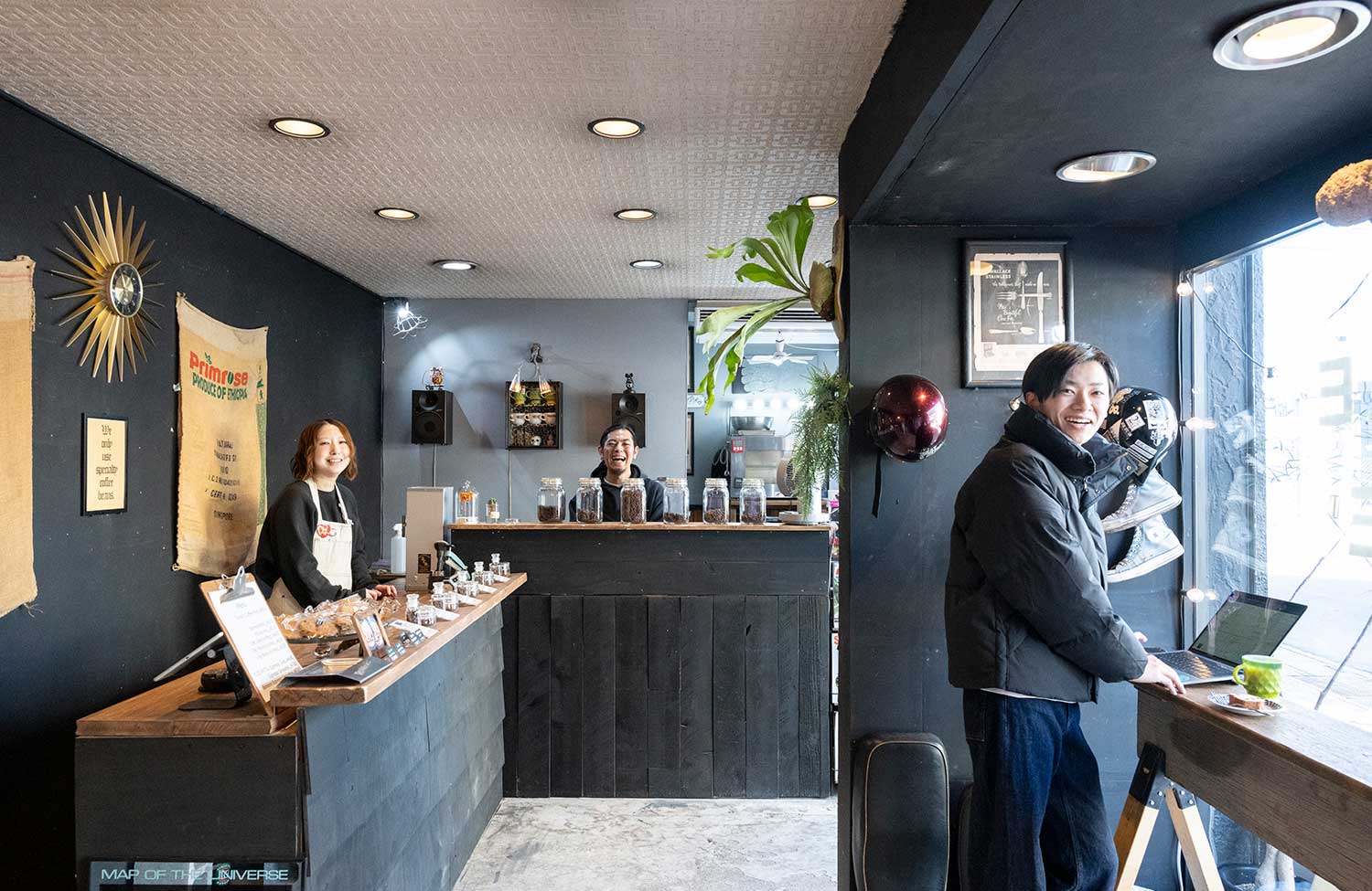 アメリカンカルチャーが薫る小粋な内装のスペシャルティコーヒーの店。自家焙煎を含めた4つの単一品種とブレンドの計5種類の豆が買え、抽出方法はフレンチプレスかペーパードリップを選べる。「朝も昼も気軽に寄れる、日常の一部になりたいです」と店主の上地蔵(うえちおさむ)さん。妻・理沙さん手焼きの菓子がコーヒーに相性よく寄り添う。