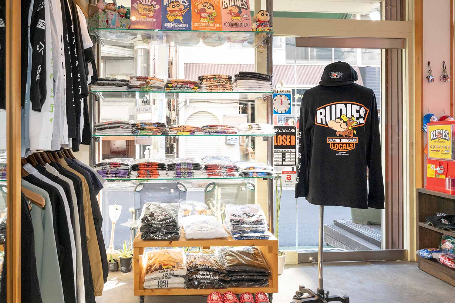 1991年に春日部駅東口で古着屋として創業し、今では2つのオリジナルブランドを扱うアパレルショップ。丈夫な素材を多用したストリートテイストのTシャツやパーカー、小物類が並ぶ中、2020年からは『クレヨンしんちゃん』のコラボ商品の姿も!「うちらしいデザインに落とし込んでいます。お客さまの層もかなり広がりましたね」と店長の清水正弘さん。