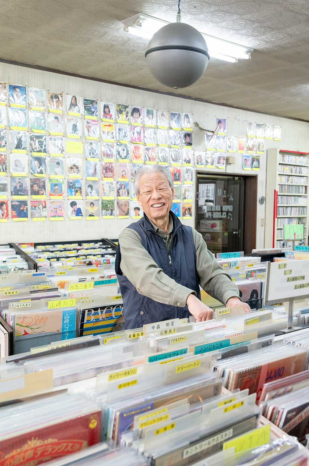 レンタルレコード店時代も含めて45年続く中古レコード店。約1万枚あるという在庫数はレコード7割、CD3割で、邦楽が強めだがオールジャンルの品揃え。特に圧倒されるEPの多さ、シングルCDのラインアップが熱い。「EPは今セール中で10枚以上買うと半額。安さもよそには負けません」と笑う藤井一義さん。ビクターの球体スピーカーも現役で、いい響き!