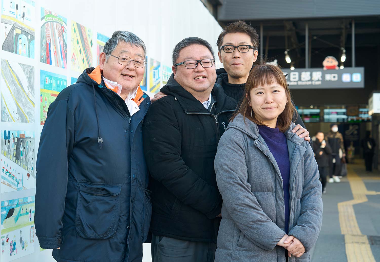 左から、「粕壁商店街 NEXT PROJECT」の小川一博さん、飯山直生さん、橋本和伸さん、三輪祐子さん。