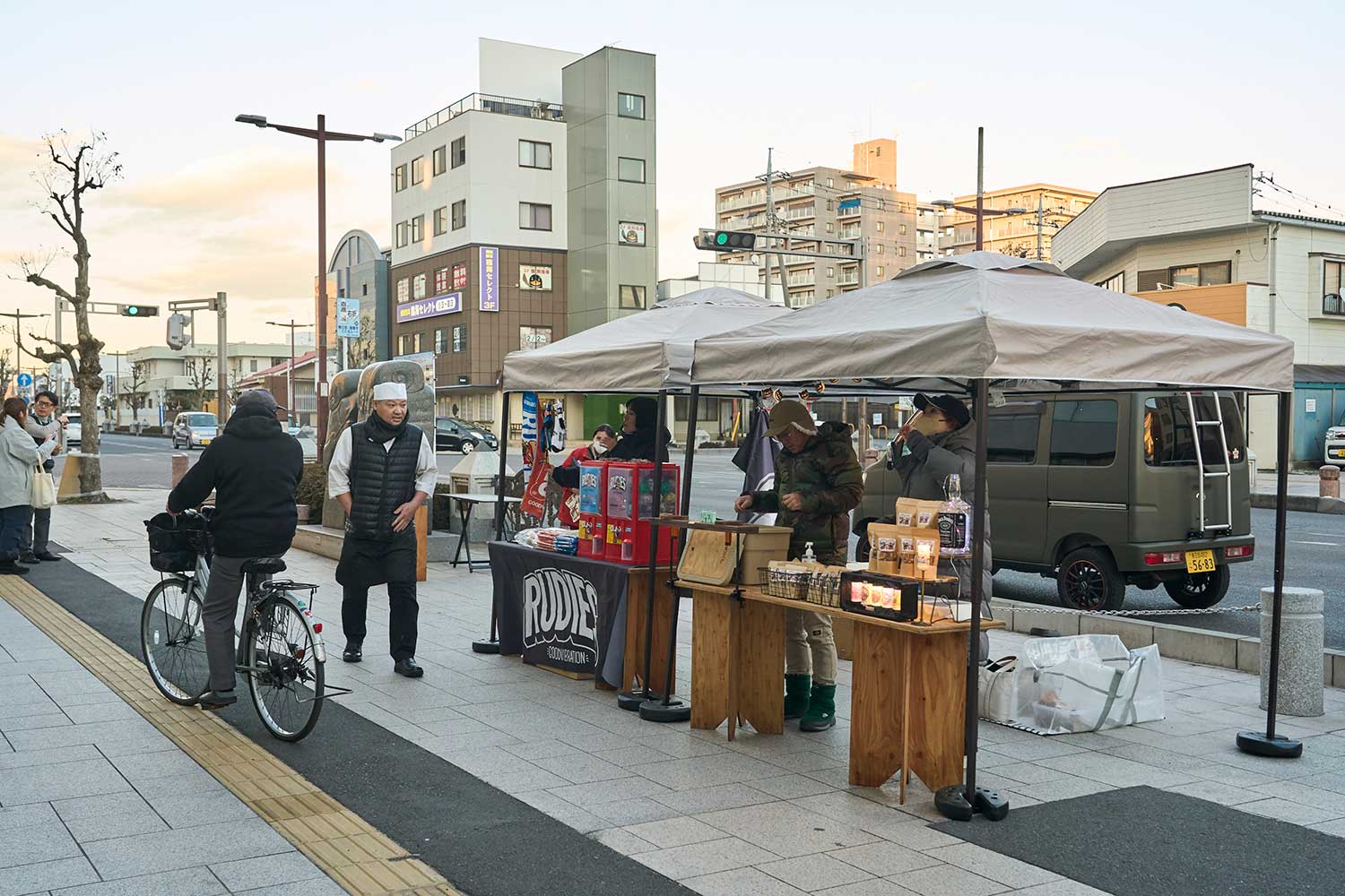 空が薄紫色に染まる黄昏(たそがれ)時、春日部駅東口から延びる広い歩道に、突如テントが立てられる。毎月第2・4金曜に定期開催されている、夜市の準備だ。