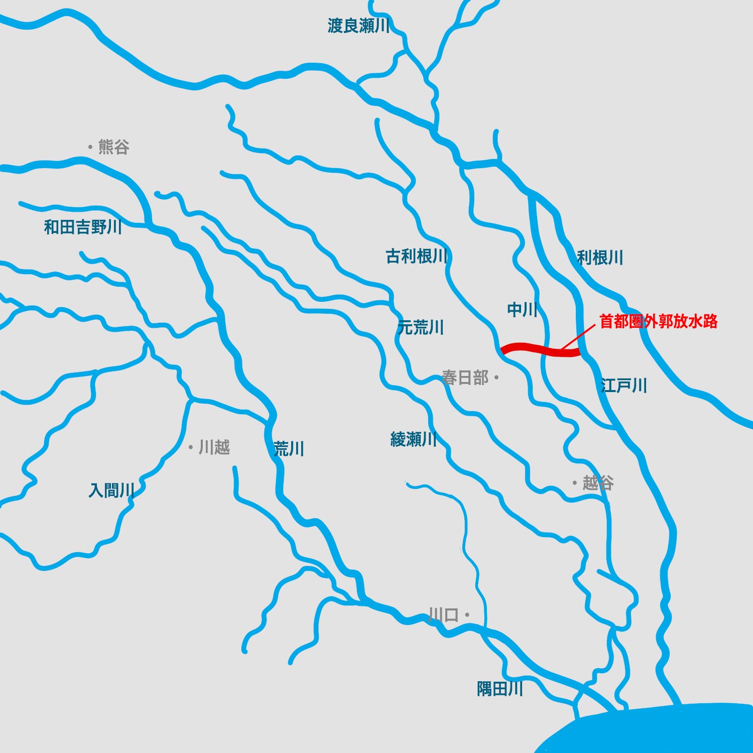 中川・綾瀬川流域の浸水被害を防ぐために建設された放水路。立坑で各河川から取り込んだ水は、国道16号の地下約50m、大落(おおおとし)古利根川から江戸川まで全長6.3kmのトンネルを経て調圧水槽に流れ込み、巨大な排水ポンプで吸い上げて江戸川へと流す。2006年の完成以降、年に平均7回ほど稼働しており、2015年9月の台風の際には約1900万立方メートルもの水を江戸川に排水した。調圧水槽などの見学会を開催している。