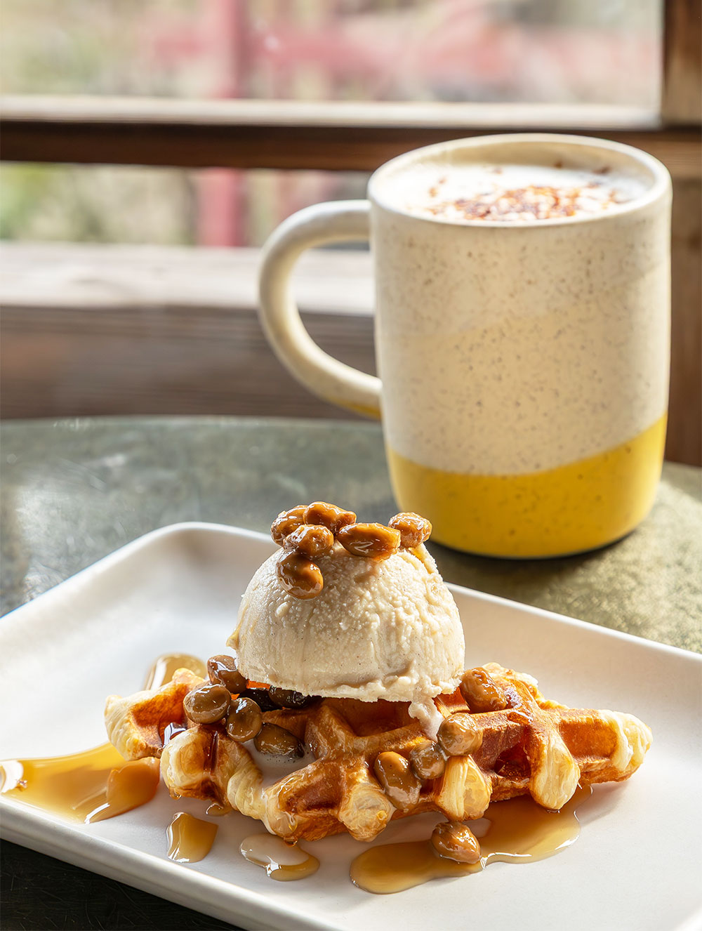 店頭で販売されているのはデビュー作の納豆「SOYFFEE(ソイフィー)」をはじめ、既存の大豆製品にとらわれない発酵食品、すぐ側にある大磯海岸の砂を練り込んだ陶器製品やロゴをあしらったアパレルグッズなど。カフェでは、季節限定のフレーバーが好評の自家製豆乳ジェラートや豆乳スムージー、こっくり濃厚な「みそラテ」500円といった体が喜ぶ、ここだけのメニューがめじろ押し。