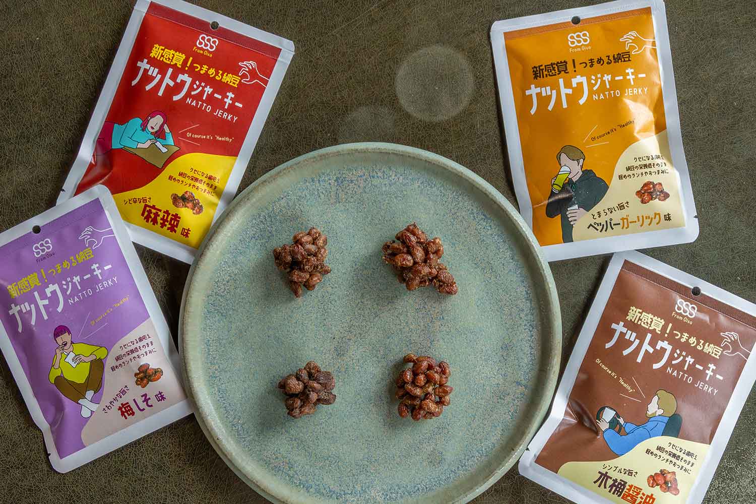 納豆の旨味と栄養素が凝縮した、オイルフリーのドライ納豆。低温乾燥でしっとり食べ応えのある食感に仕上げ、かむほどに納豆を感じる。木桶醤油、ペッパーガーリック、麻辣、梅しその4種類。
