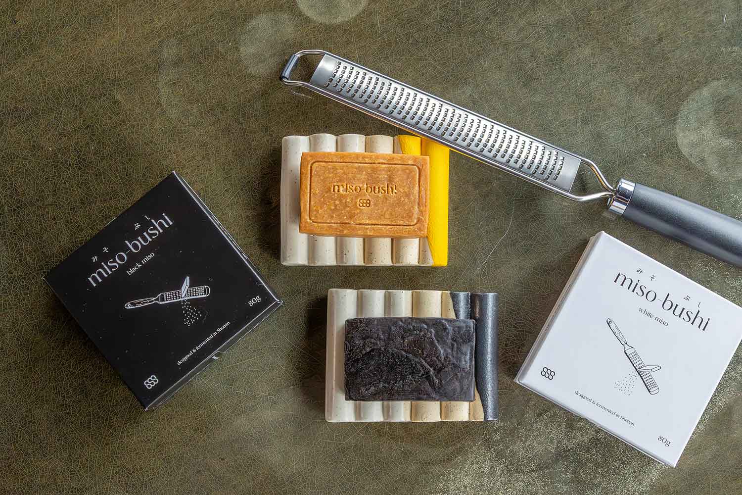ハードチーズのように使う量だけ削ってかけられる固形味噌。魚料理に合う白味噌と肉料理向きの黒味噌の2種類。神奈川県小田原の老舗味噌蔵『加藤兵太郎商店』の木桶仕込みの味噌を使っている。