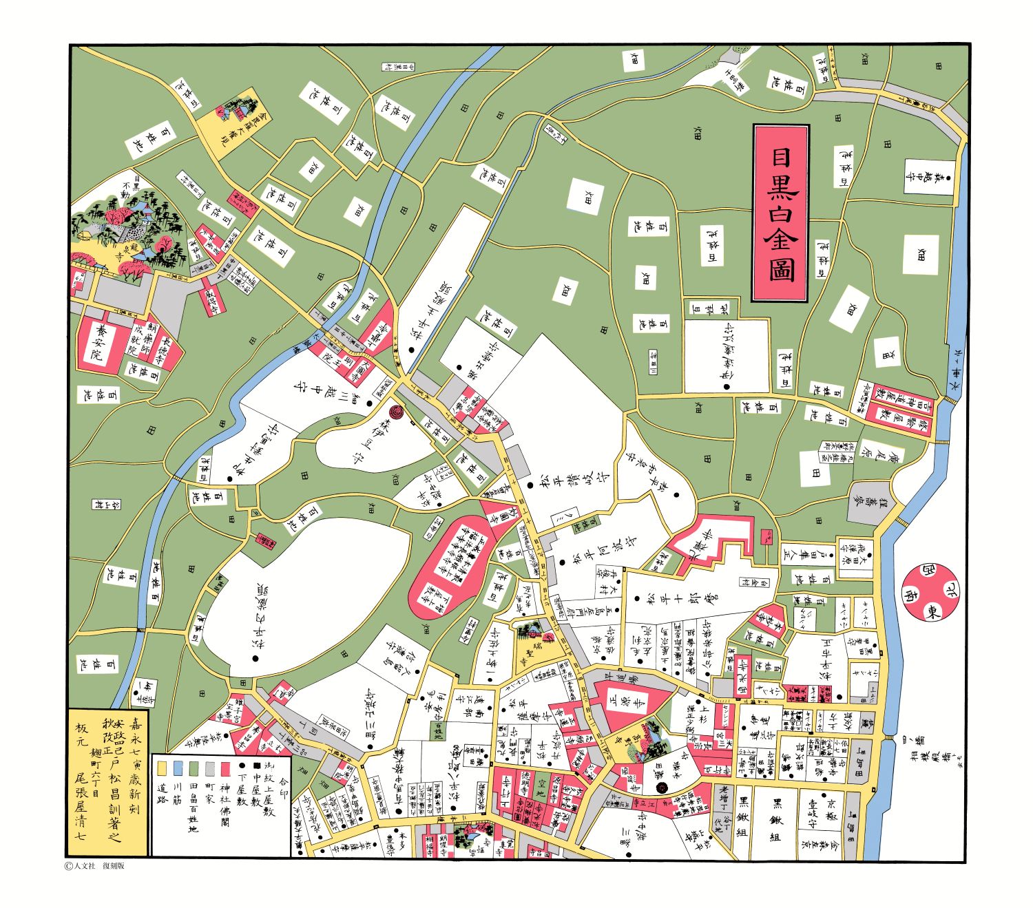 現在では高級住宅地の目黒や白金だが、江戸時代には郊外に位置付けられ、田畑が広がっていた。「太鼓橋」や「行人サカ」は錦絵にも描かれる名所だった。「瀧泉寺」は徳川3代将軍家光によって江戸鎮護のために置かれた江戸五色不動の筆頭となり、江戸中心部から気軽に行ける行楽地として多くの人が訪れていた。近くの五百羅漢寺は明治時代にこの地に移転してきたが、元禄時代に一人の僧が彫った305体の羅漢像が鎮座する。