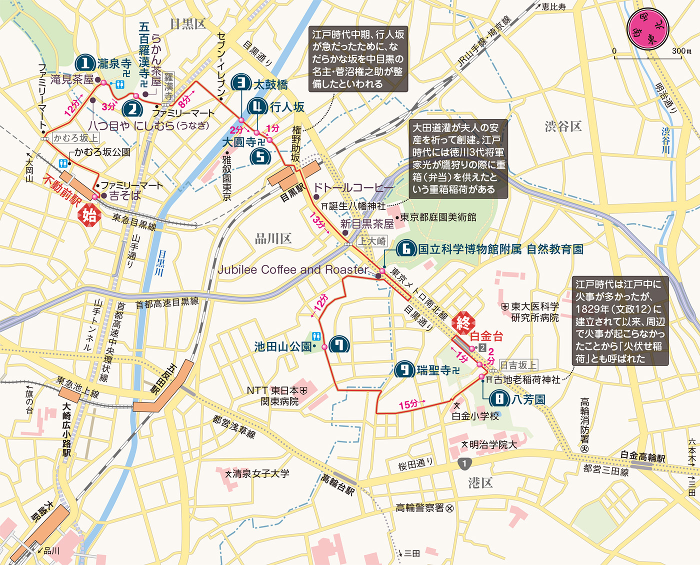 東急目黒線不動前駅→(12分/0.8km)→瀧泉寺→(3分/0.2km)→五百羅漢寺→(8分/0.6km)→太鼓橋→(2分/0.1km)→行人坂→(1分/0.1km)→大圓寺→(13分/0.9km)→国立科学博物館附属自然教育園→(12分/0.8km)→池田山公園→(15分/1.0km)→八芳園→(2分/0.2km)→瑞聖寺→(1分/0.1km)→地下鉄南北線・三田線白金台駅