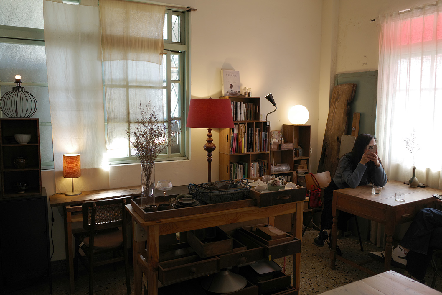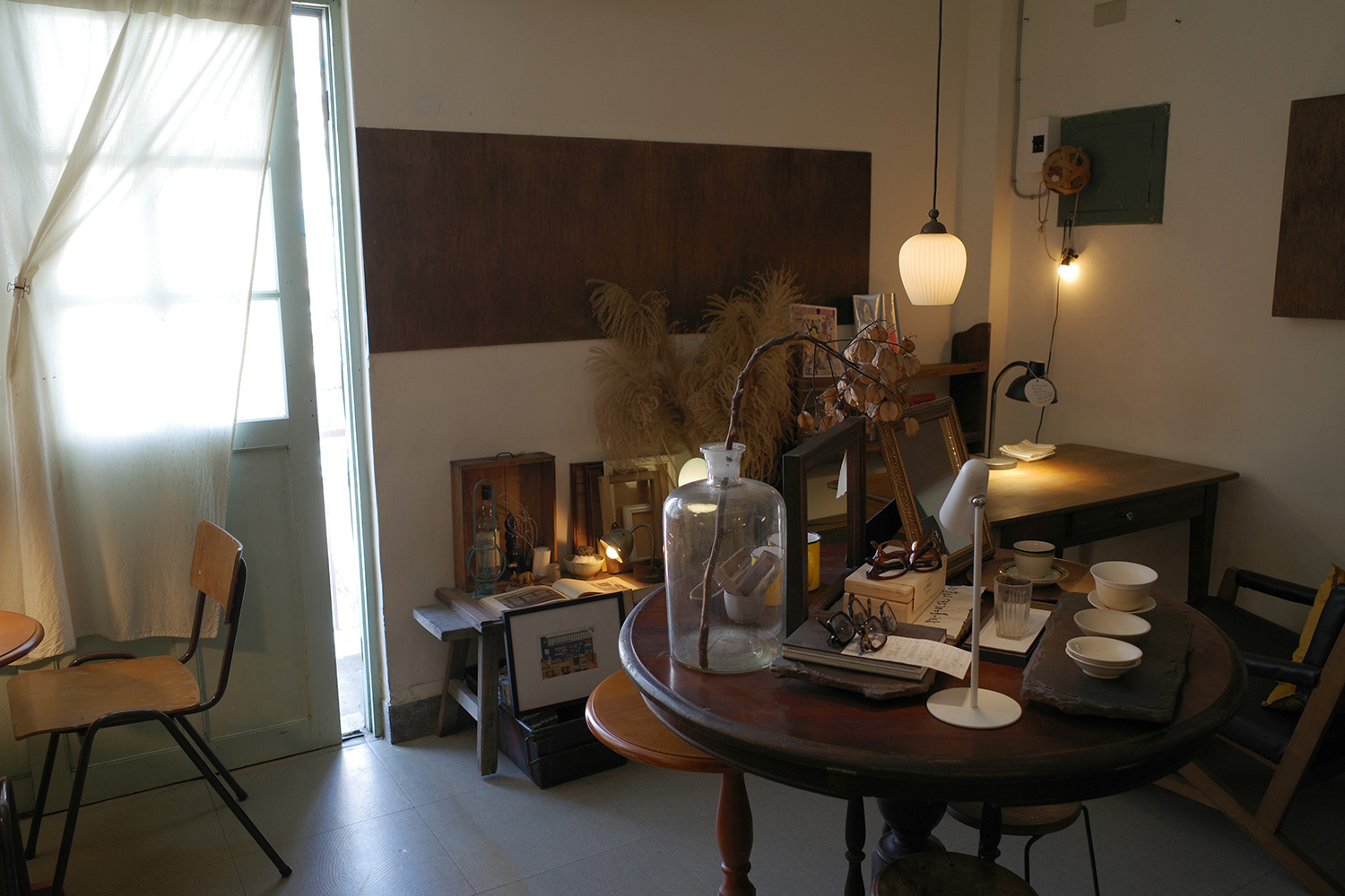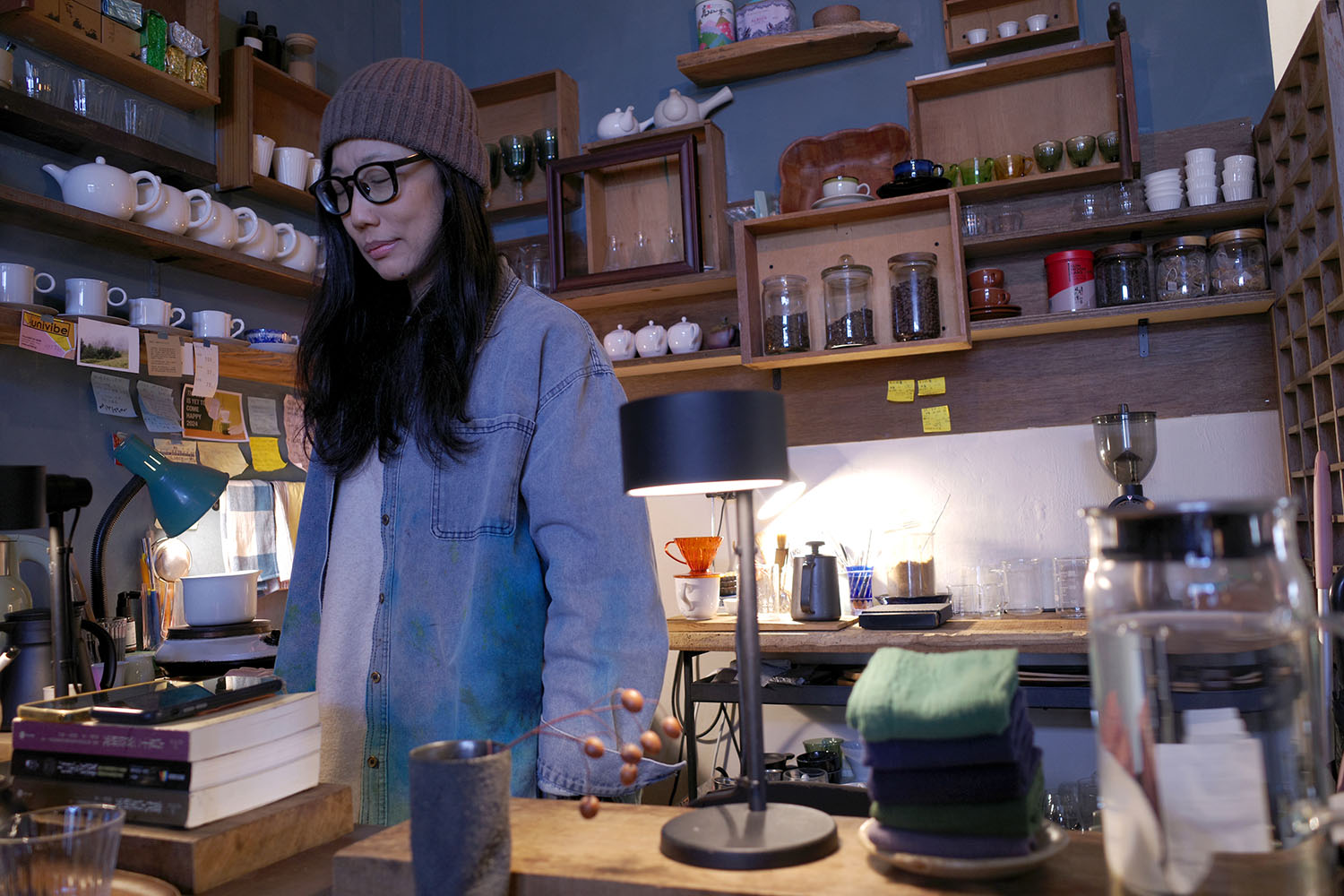 窓に洗いざらしの白カーテンを垂らした室内は、ほんのり暗い。その中に、ひかえめに灯る電灯と使い込んだ木製家具が配されている。棚には本、客席ではないテーブルには雑貨小物が、絶妙のざっくり加減で並ぶ。いずれも売り物だ。アバウトな要素をまとめあげる大人びたセンスがすばらしい。