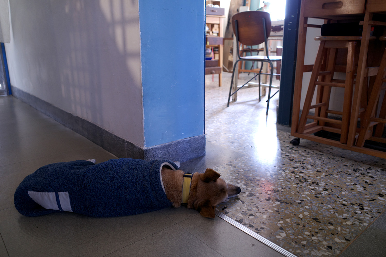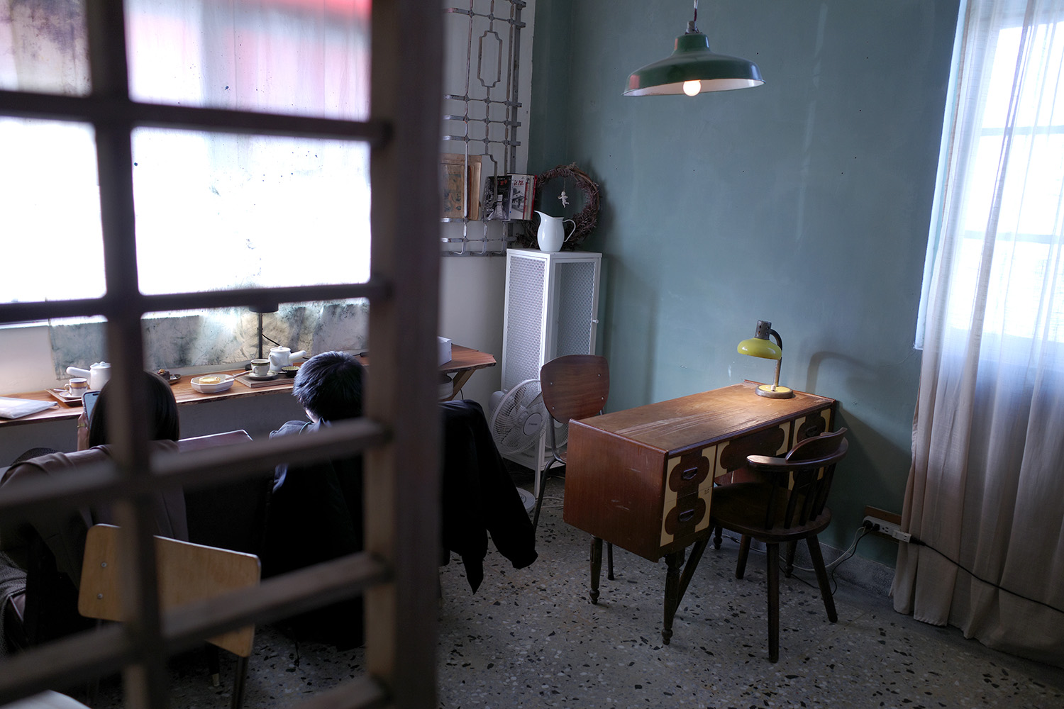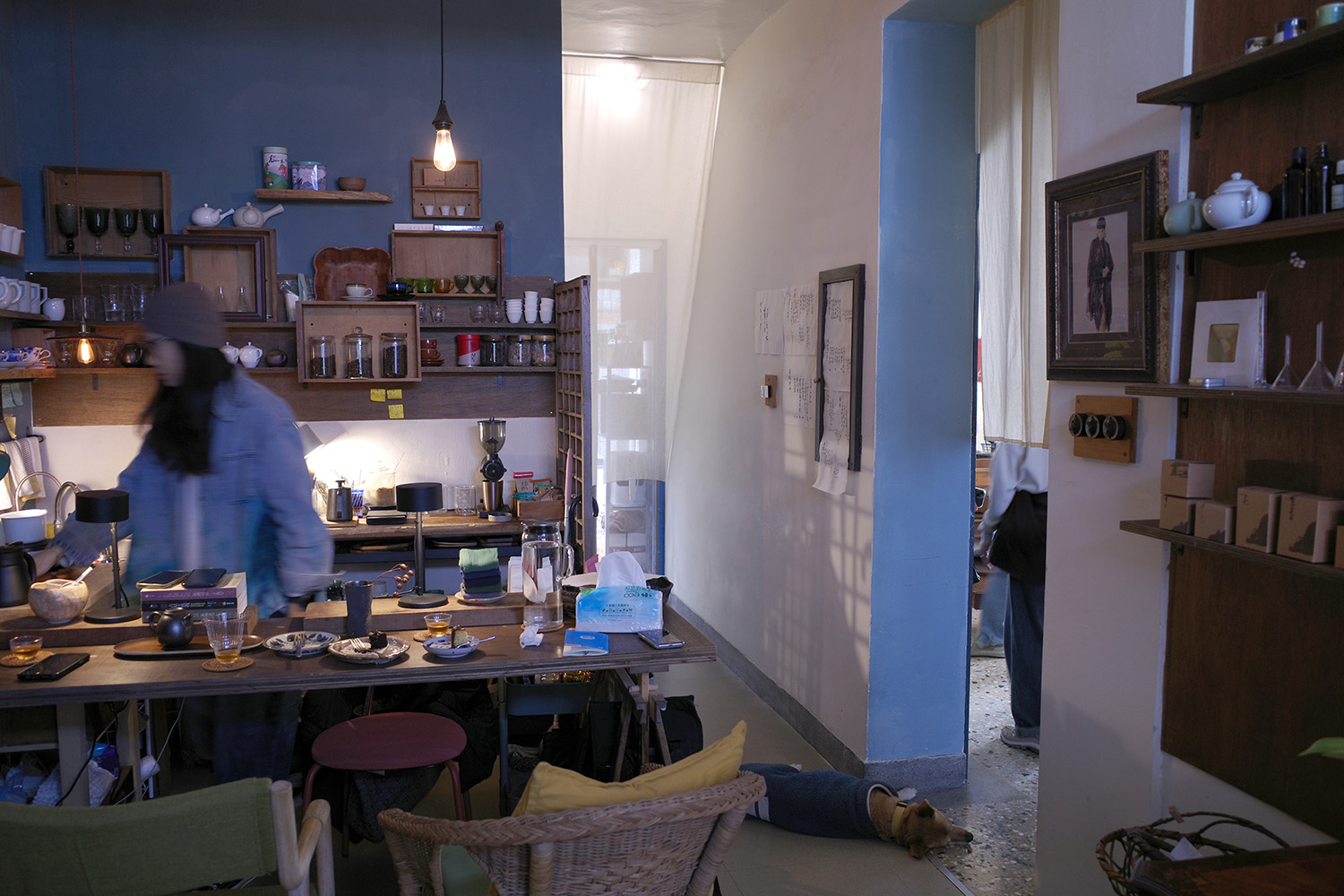 部屋は3室に分かれ、白と青に塗り分けた壁が空間にメリハリを生み出している。床は台湾の古建築でよく目にするテラゾー(人造大理石)製。その上を老犬がよたよた歩き回っている(おさわり不可)。ロードムービーの一場面のようだ。地元のお客さんも心得たもので、静かに飲み物をすすりつつ、空間の妙を思い思いに楽しんでいる。
