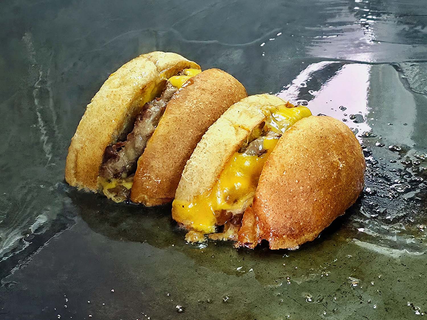 その名の通りハンバーガーをふたつに切ったやつです。多くのメディアでも話題ですが、ビジュアルのインパクトだけでなく切っている意味もあるとのこと。