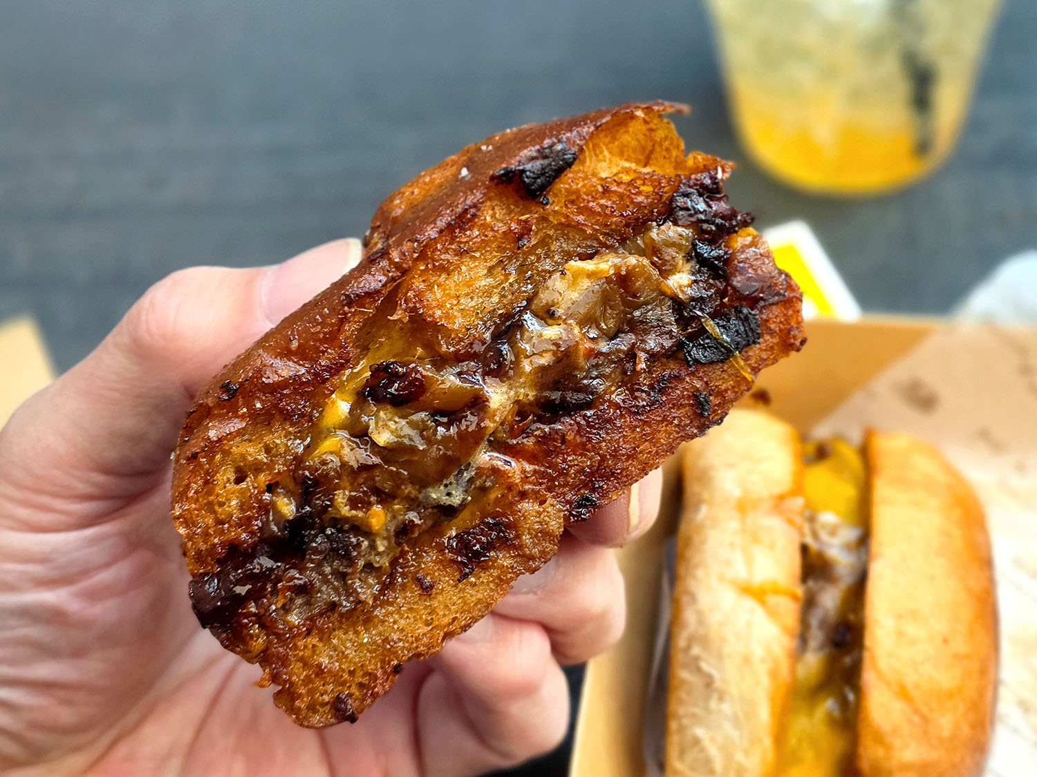 焼き上げたパティの上に3日以上かけて仕上げた煮玉ねぎとチーズをのせて、バンズで挟みます。