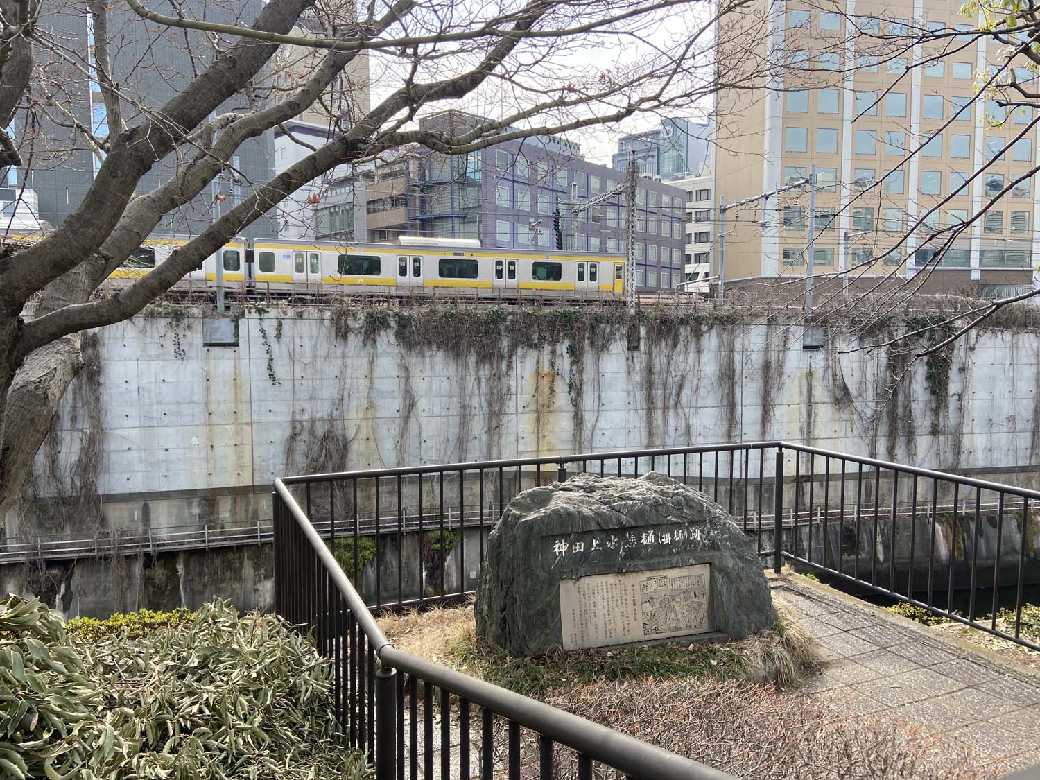 『元町ウェルネスパーク』から外堀通りに出て、水道橋駅方面へ歩く。途中神田川沿いに「神田上水懸樋(掛樋)跡」と記された碑がある。先ほど水道歴史館で模型を見た、あの掛樋があったところだ。かつてここから神田上水が神田川を越えて神田・日本橋方面まで流れていた。今は対岸を中央線の電車が走り、その下の護岸にも掛樋の痕跡などは残っていない。