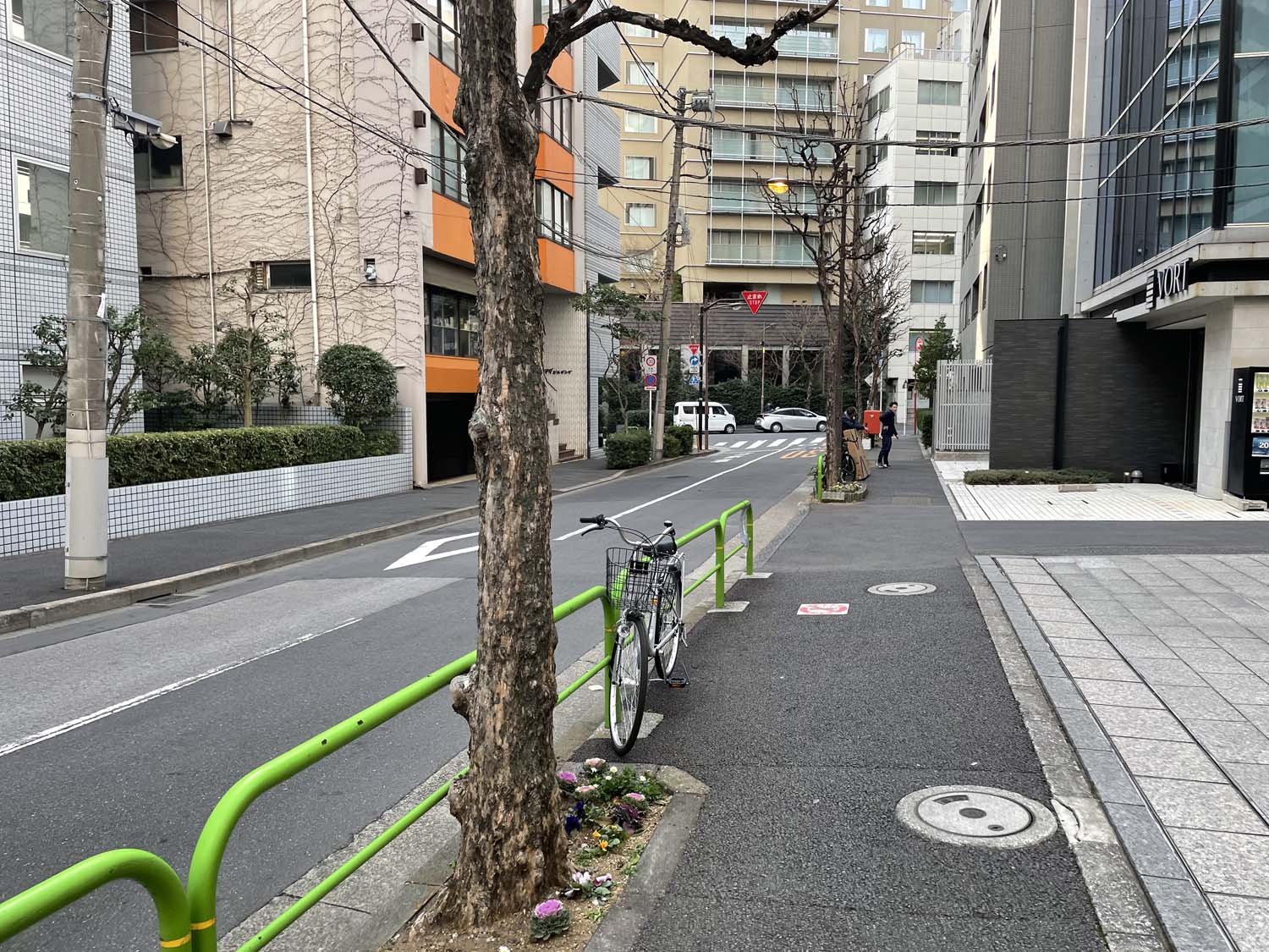 坂の途中にある標識の解説によると、猿楽町と駿河台の境にあるこの崖地にはもともと通路がなく、関東大震災後の復興事業により男坂と西側にある女坂の2本の坂が整備されたそうだ。アプリ「スーパー地形」でこの辺りの標高を調べると、猿楽通りが7m前後、男坂を上ったとちの木通りが21mくらいなので13mほどの高低差がある。平坦な低地で暮らしているので、こうした地形のダイナミズムを感じる風景に出合うといつも新鮮に驚く。