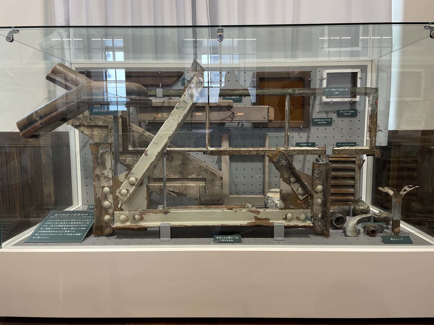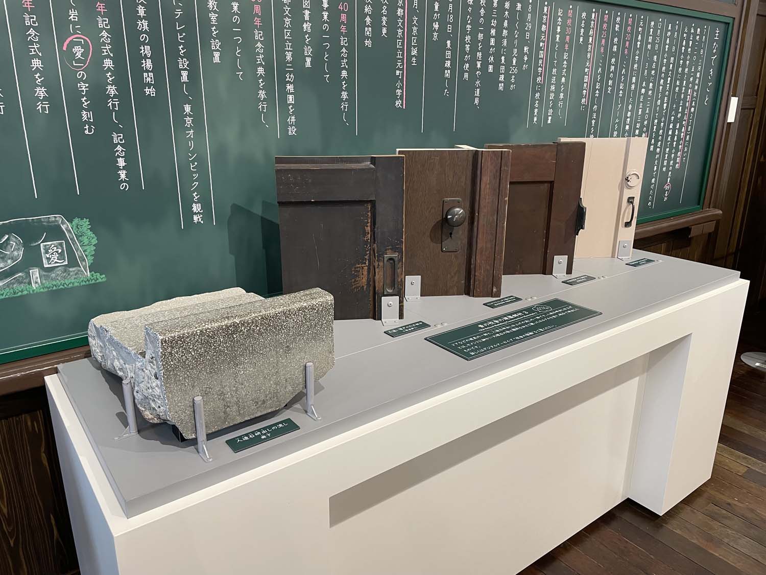ウェルネスパーク内には建築当時の教室を復元した「歴史展示室」があり、元町小学校で使用されていた建築部材や校舎模型、デジタルアーカイブなどを見ながら元町小学校の歴史を知ることができる。