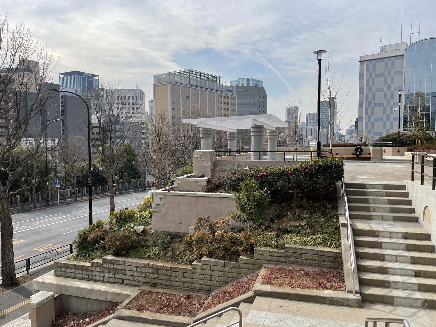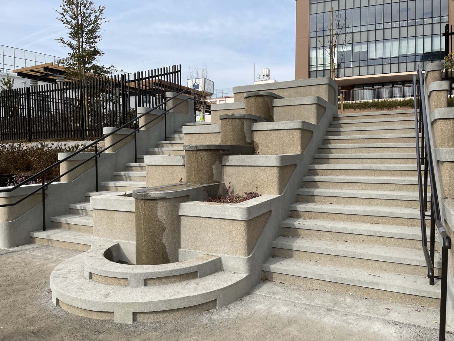 ウェルネスパークの隣、外堀通りに面した傾斜地に元町公園がある。外堀通り側の入り口から大階段を上ると正面にアーチ模様の壁泉、さらに左の階段を上ると水階段(カスケード)が見えてくる。