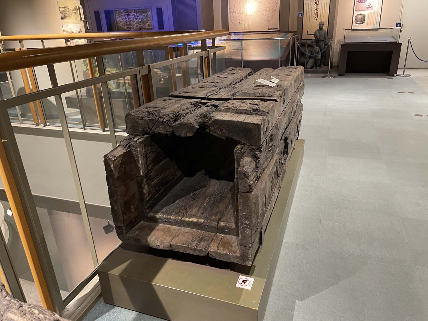 当時水道管の役割を担っていた樋は、木や石で作られていて、展示では実物を見ることができる。木樋には水に強い松や檜(ひのき)の木が使用され、ふたの合わせ目を舟釘で留めたり、隙間に木の皮を詰めるなど、漏水を防ぐ工夫がなされている。よく腐らずに残っているなと思ったが、台地に埋設されていた木樋は腐食しやすく、現在残っているのはほとんど低地のものだそうだ。