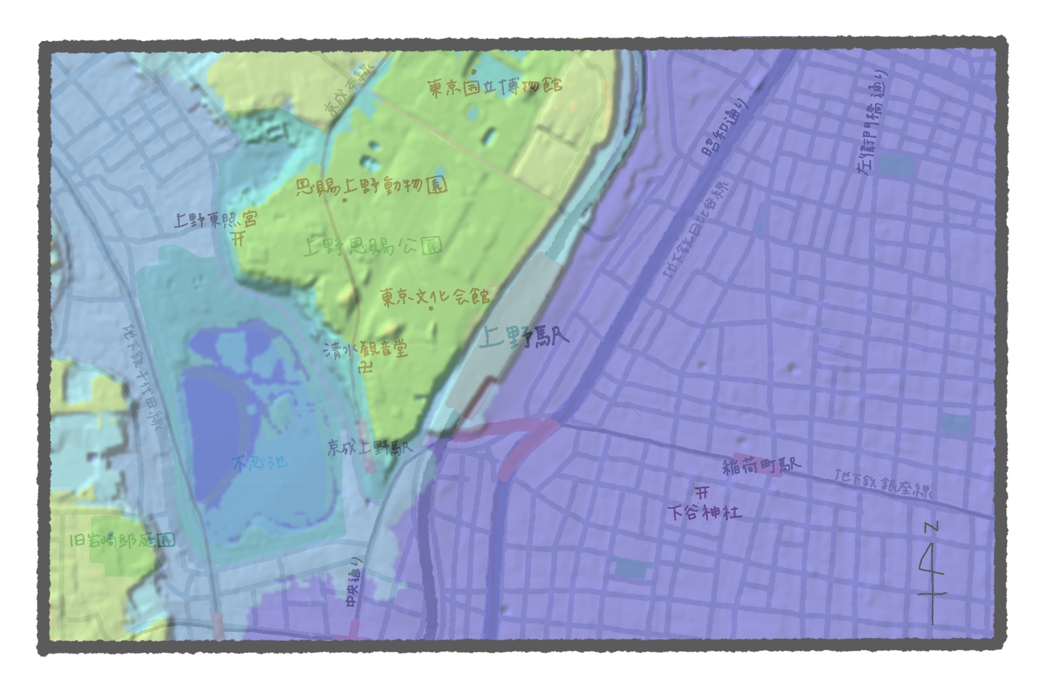 上野台地の東側に広がる低地は下谷と呼ばれた一帯で、寛永寺の創建後は門前町として栄え、武家屋敷や長屋が立ち並ぶ地域だった。直線で直角に交わる道路が細かく敷かれているとあらば、山手線のなかでも東側ではないかと推測できるわけだ。