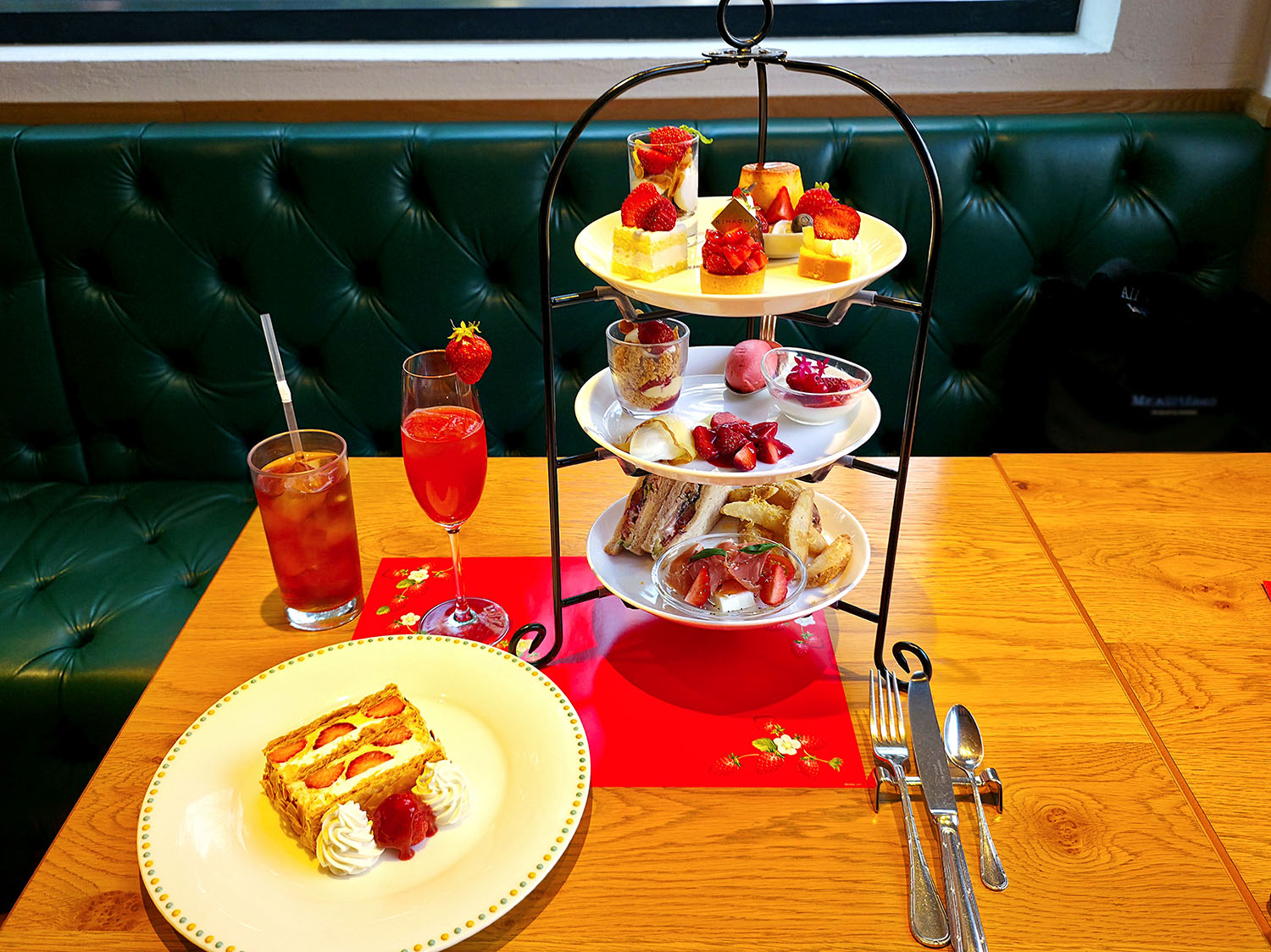 アフタヌーンティーには、ウェルカムドリンクとして苺を添えたスパークリングワイン、またはモクテルが最初に提供され、その後は赤ワイン・白ワイン・コーヒー・紅茶・ハーブティーがフリードリンクになります。※90分制。