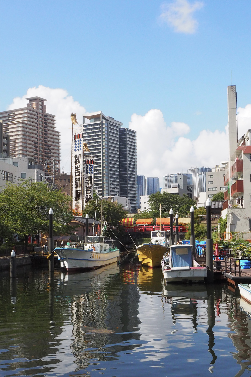 江戸時代に徳川家康が大阪から呼び寄せた漁師たちが、隅田川河口の浅瀬を埋め立てて造成した島が佃島。周囲の埋め立てが進んだ後は堀の両端が海につながっていたが、1964年に佃大橋が完成したことで行き止まりの堀になって今に至る。周囲には船宿もあり、入堀は船溜として使われていて佃小橋の向こうには船がいくつも浮かんでいる。漁師町としての面影は今も色濃い。