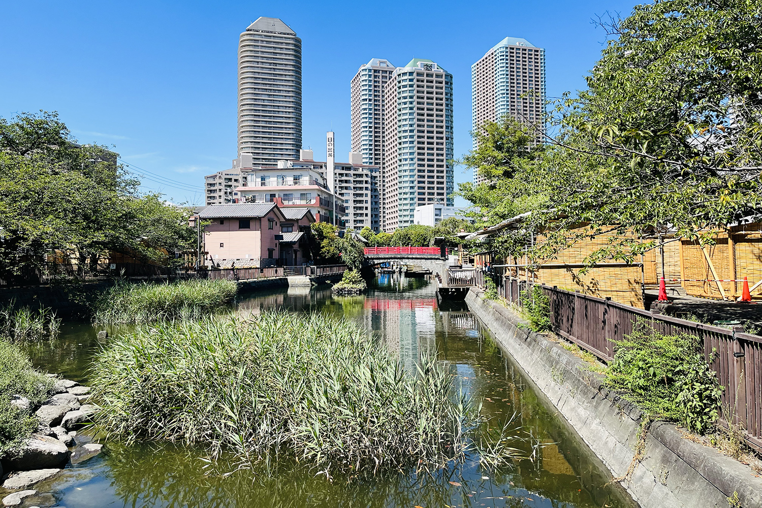 いわゆる「佃島」にある入堀。写真は堀の先端から北方面を見たところで、中央に見える赤い橋が佃小橋だ。奥のタワーマンションたちは、「石川島」に立つ「大川端リバーシティ21」。1980年代から石川島播磨重工業(現IHI)の工場跡地につくられた、いわばウォーターフロント開発の先駆け的なタワマン群ともいえる。堀のそばにあり、大きな煙突の文字が目を引く『日の出湯』も大きなヒントだ。