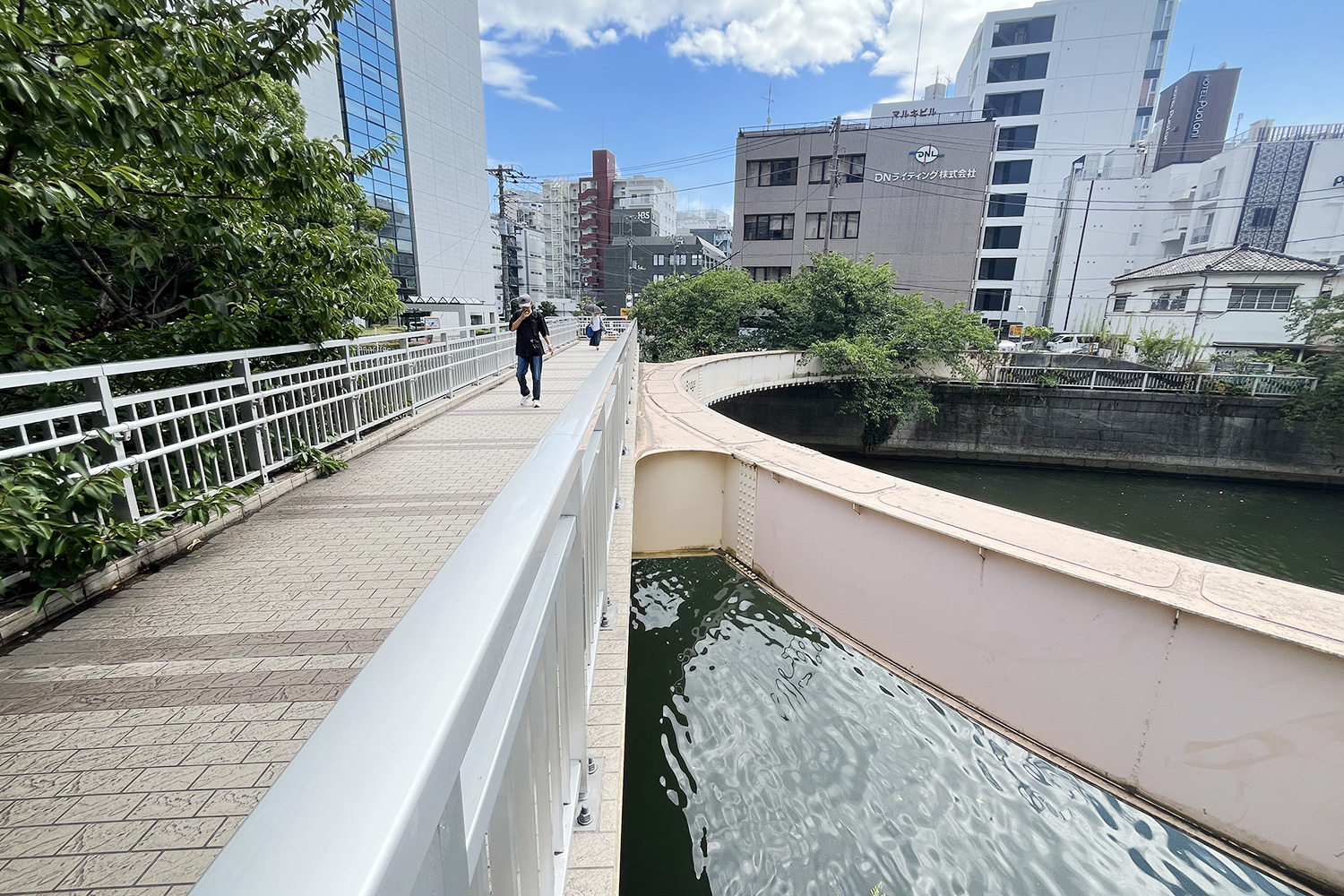 その奥には、目黒川に架かる歩行者専用のふれあいK字橋が見えている。その名の通り「K字」の形をしている橋で、この画角では「K字」かどうかは見分けがつかないが、写真をよくよく拡大すると橋梁に橋の名前が書いてあるのが見える。