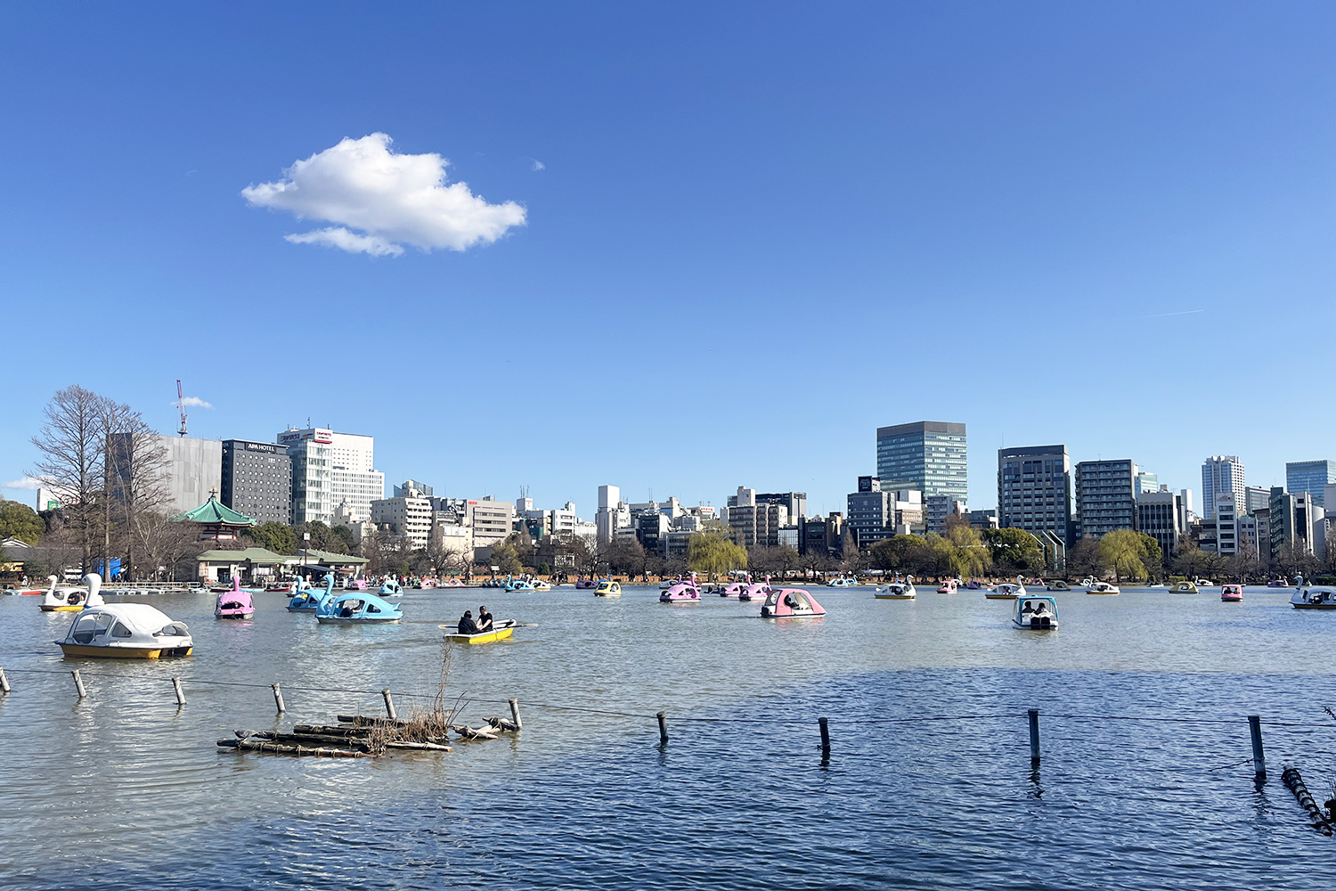 池の北側から南方面を撮ったところ。不忍池は「鵜の池」「蓮池」「ボート池」の3つに分かれていて、写真は「ボート池」だ。不忍池らしさのひとつである蓮の葉が見えない場所と画角ではあるが、とはいえこの大きさとスワンボートの姿ですぐにわかった方も多いのではないだろうか。