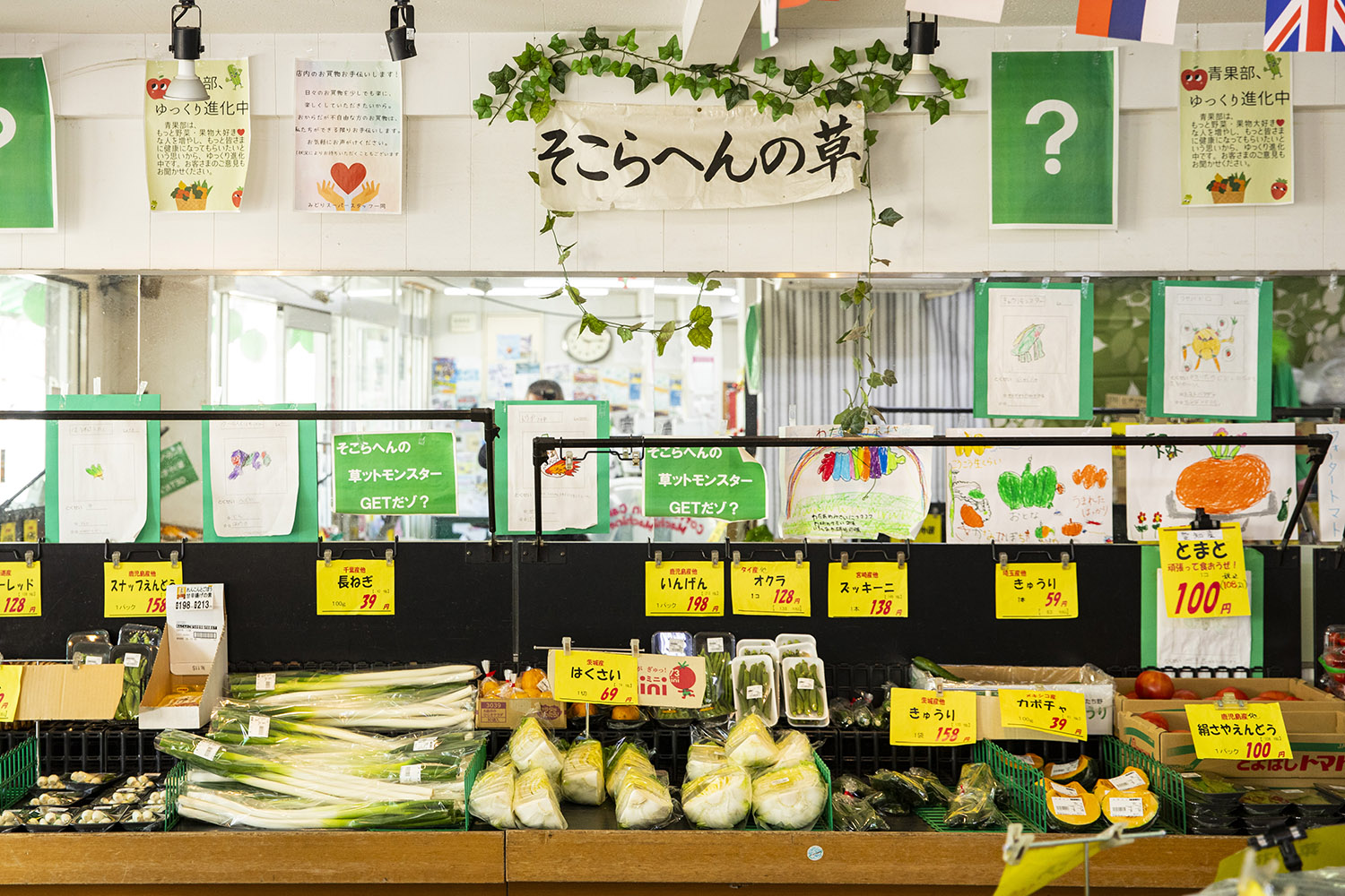 店内に貼られる書道や草モンスターの絵、自由研究などは、ほとんどが近隣の小学生が書いたもの。ハッとさせられる、秀逸な作品もあったりする。みどりさんいわく「草育」なんだって。