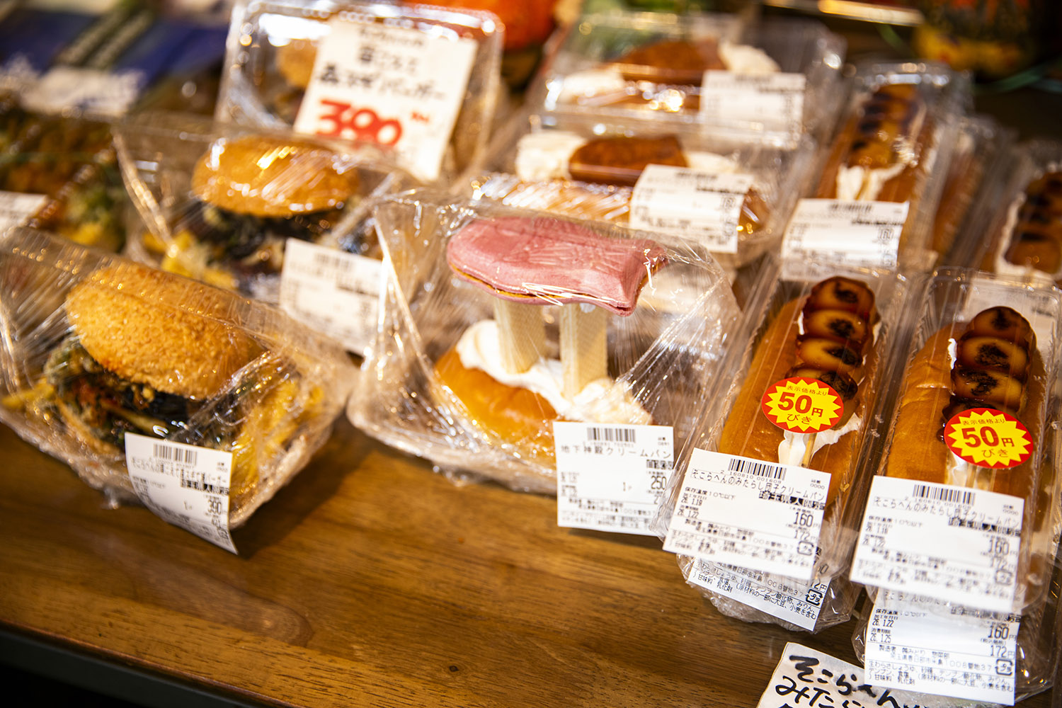 では、魔窟のごとき店内を見て回ろう。総菜売り場に立ち寄ると、「ぷりぷりケツぷりんパン」や「地下神殿クリームパン」など、個性強すぎる品々がズラリ。串に刺さった団子がのった「みたらしクリームパン」なんて、どうやって食べたらいいんだ。