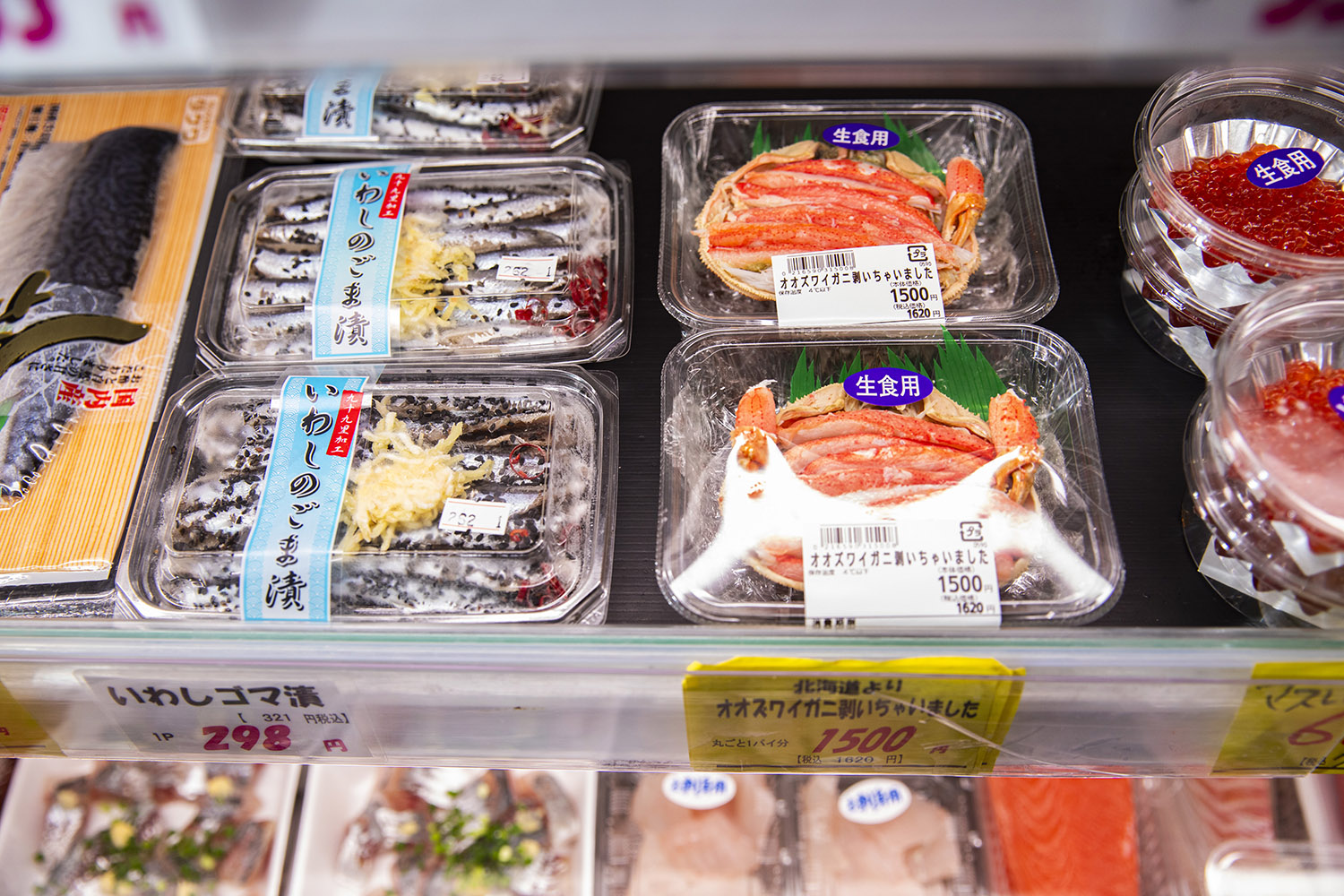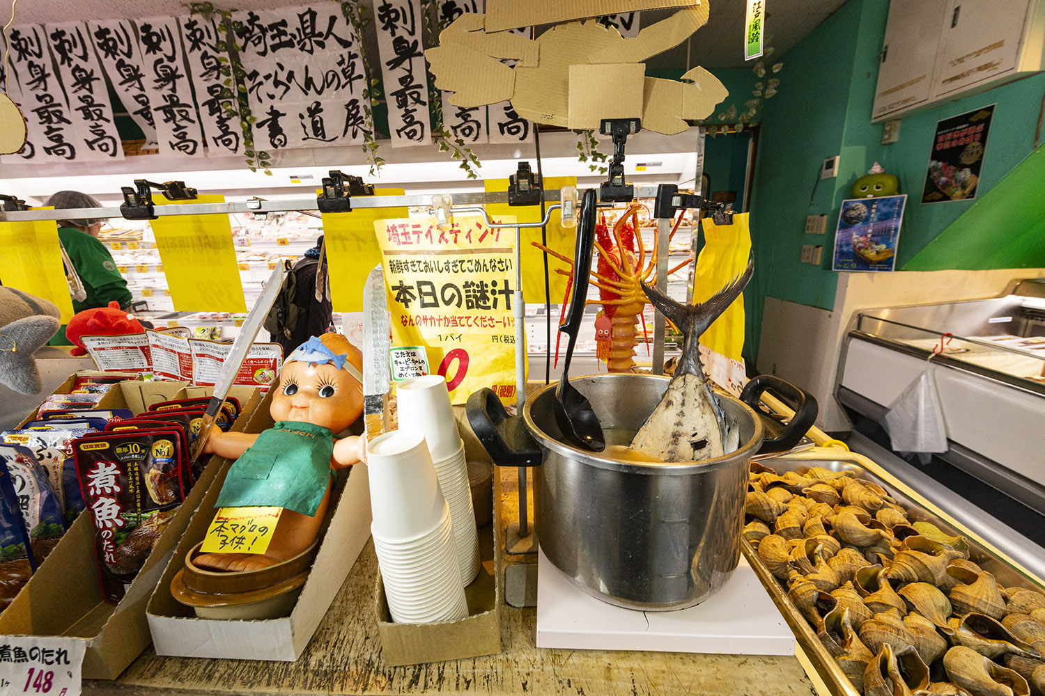 でっかい切り身や蒸したてのサザエ。殻を剥いたカニなどが破壊級の価格で並び、あっという間に売り切れる。常連はこれを求めているんだ! 某宇宙戦艦パロの船盛りPOPもいい味出している。