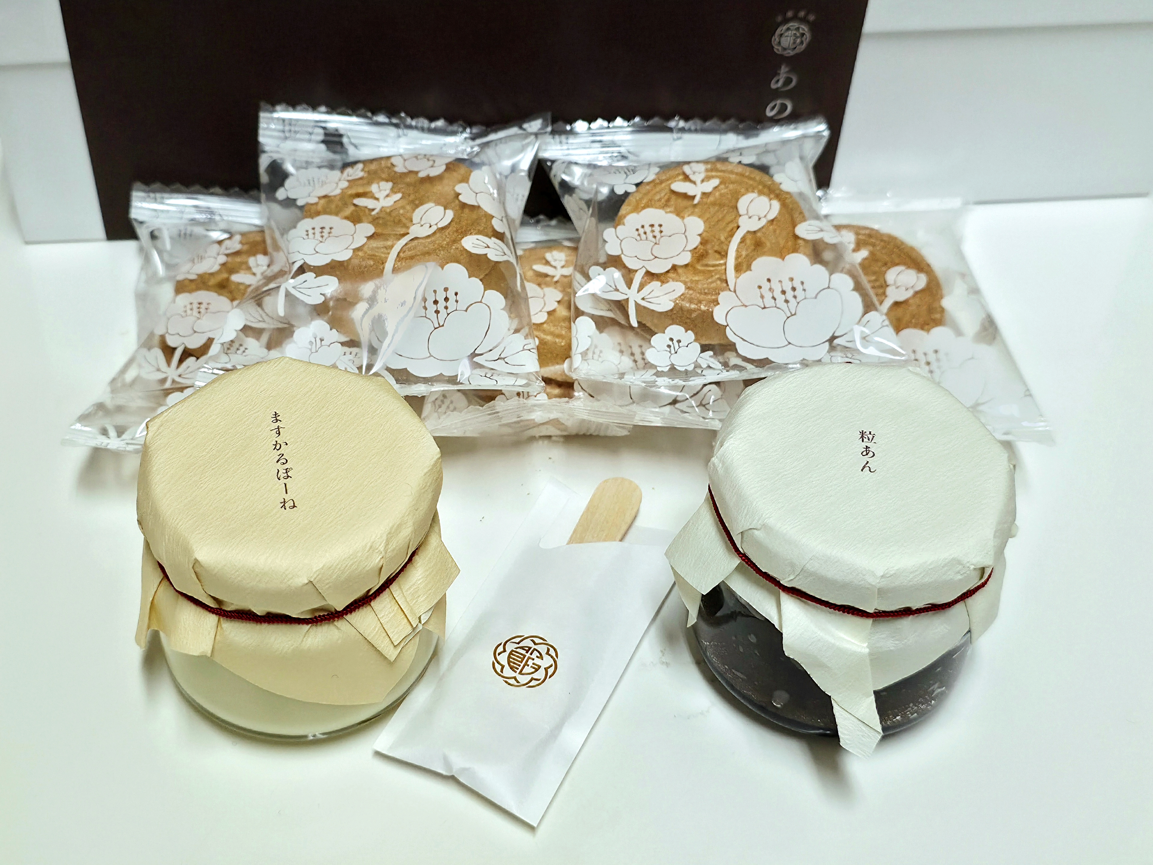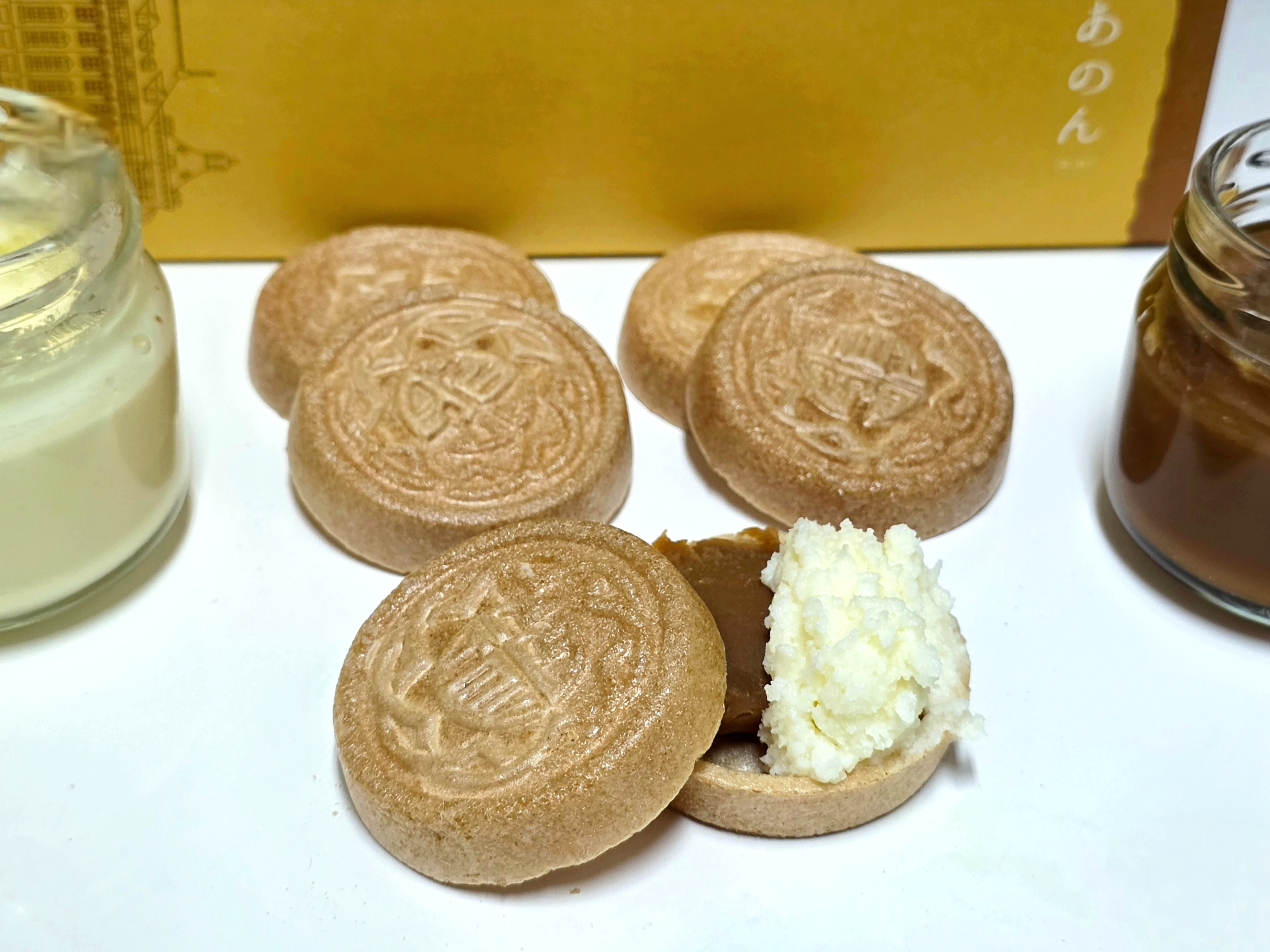 箱の中には、5組の最中の皮と2種類のクリームのビンが入っています。